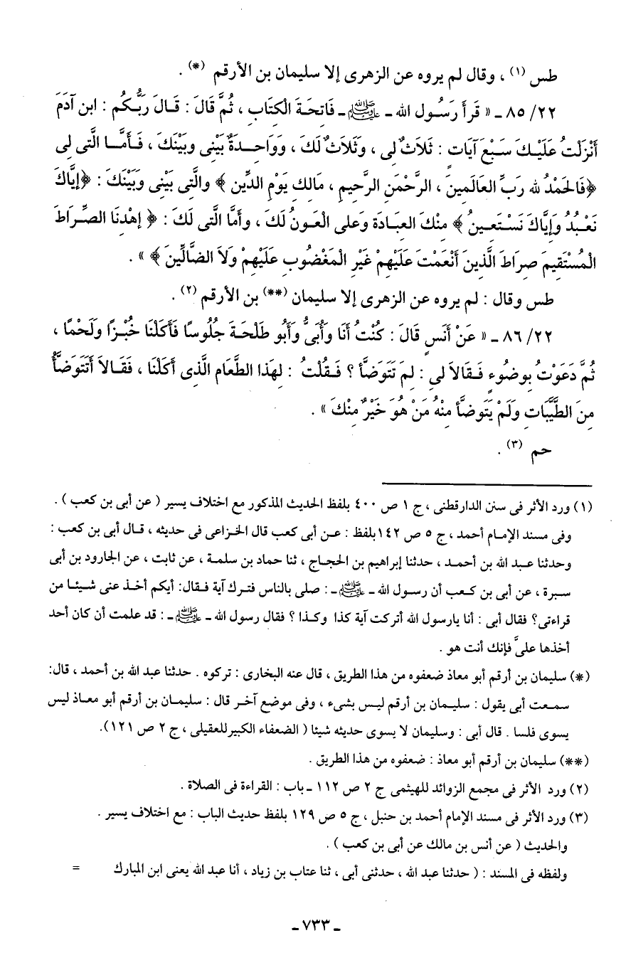 (¬1) ورد الأثر في سنن الدارقطني، ج 1 ص 400 بلفظ الحديث المذكور مع اختلاف يسير (عن أبي بن كعب). وفي مسند الإمام أحمد، ج 5 ص 142 بلفظ: عن أبي كعب قال الخزاعى في حديثه، قال أبى بن كعب: وحدثنا عبد الله بن أحمد، حدثنا إبراهيم بن الحجاج، ثنا حماد بن سلمة، عن ثابت، عن الجارود بن أبى سبرة، عن أبي بن كعب أن رسول الله - صلى الله عليه وسلم -: صلى بالناس فترك آية فقال: أيكم أخذ عني شيئًا من قراءتى؟ فقال أبى: أنا يا رسول الله أتركت آية كذا وكذا؟ فقال رسول الله - صلى الله عليه وسلم -: قد علمت أن كان أحد أخذها علىَّ فإنك أنت هو.