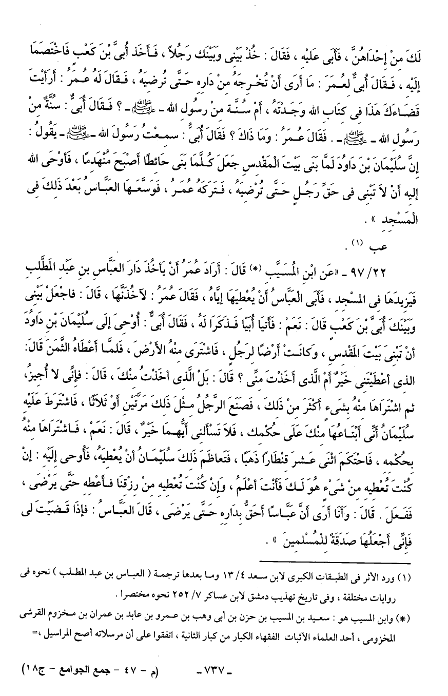 22/ 97 - "عَن ابْنِ المُسَيَّبِ (*) قَالَ: أَرَادَ عُمَرُ أَنْ يَأخُذَ دَارَ العَبَّاسِ بنِ عَبْدِ المَطَّلِبِ فَيَزِيدَهَا في المسْجِدِ، فَأَبَى الْعَبَّاسُ أَنْ يُعْطِيَهَا إيَّاهُ، فَقَالَ عُمَرُ: لآخُذَنَّهَا، قَالَ: فاجْعَلْ بَيْنِي وَبَيْنَكَ أُبَىَّ بْنَ كَعْبٍ قَالَ: نَعَمْ: فَأَتيَا أُبَيّا فَذَكَرَا لَهُ، فَقَالَ أُبَىٌّ: أُوْحِىَ إلَى سُلَيْمَانَ بْنِ دَاوُدَ أنْ تَبْنِيَ بَيْتَ المَقْدِسِ، وَكانَتْ أَرْضًا لِرَجُلٍ، فَاشْتَرَى مِنْهُ الأَرْضَ، فَلمَّا أَعْطَاهُ الثَّمَنَ قَالَ: الذِى أعْطَيْتَنِي خَيْرٌ أَمْ الَّذى أَخَذْتَ مِنِّي؟ قَالَ: بَلْ الَّذِي أخَذْتُ مِنْكَ، قَالَ: فإِنِّى لا أُجِيزُ، ثمَّ اشْتَرَاهَا مِنْهُ بِشَئٍ أَكْثَرَ مِنْ ذَلِكَ، فَصَنَعَ الرَّجُلُ مِثْلَ ذَلِكَ مَرَّتَيْنِ أَوْ ثَلاَثًا، فَاشْتَرَطَ عَلَيْهِ سُلَيْمَانُ أَنِّى أَبْتَاعُهَا مِنْكَ عَلَى حُكْمِك، فَلاَ تَسْأَلنِي أَيُّهمَا خَيْرٌ، قَالَ: نَعَمْ، فَاشْتَرَاهَا مِنْهُ بِحُكْمِهِ، فَاحْتَكَمَ اثْنَى عَشرَ قِنْطَارًا ذَهَبًا، فَتَعاظَمَ ذَلِكَ سُلَيْمَانُ أنْ يُعْطِيَهُ، فَأُوحى إِلَيْهِ: إنْ كُنْتَ تُعْطِيهِ مِنْ شَىْءِ هُوَ لَكَ فَأَنْتَ أعْلَمُ، وَإِنْ كُنْتَ تُعْطِيهِ مِنْ رِزْقِنَا فأَعْطِهِ حَتَّى يَرْضَى، فَفَعَلَ. قَالَ: وَأَنَا أَرَى أَنَّ عَبَّاسًا أَحَقُّ بِدَارِهِ حَتَّى يَرْضَى، قَالَ العَبَّاسُ: فإذَا قَضَيْتَ لي فَإِنِّي أَجْعَلُهَا صَدَقَةً لِلْمُسْلمِينَ".