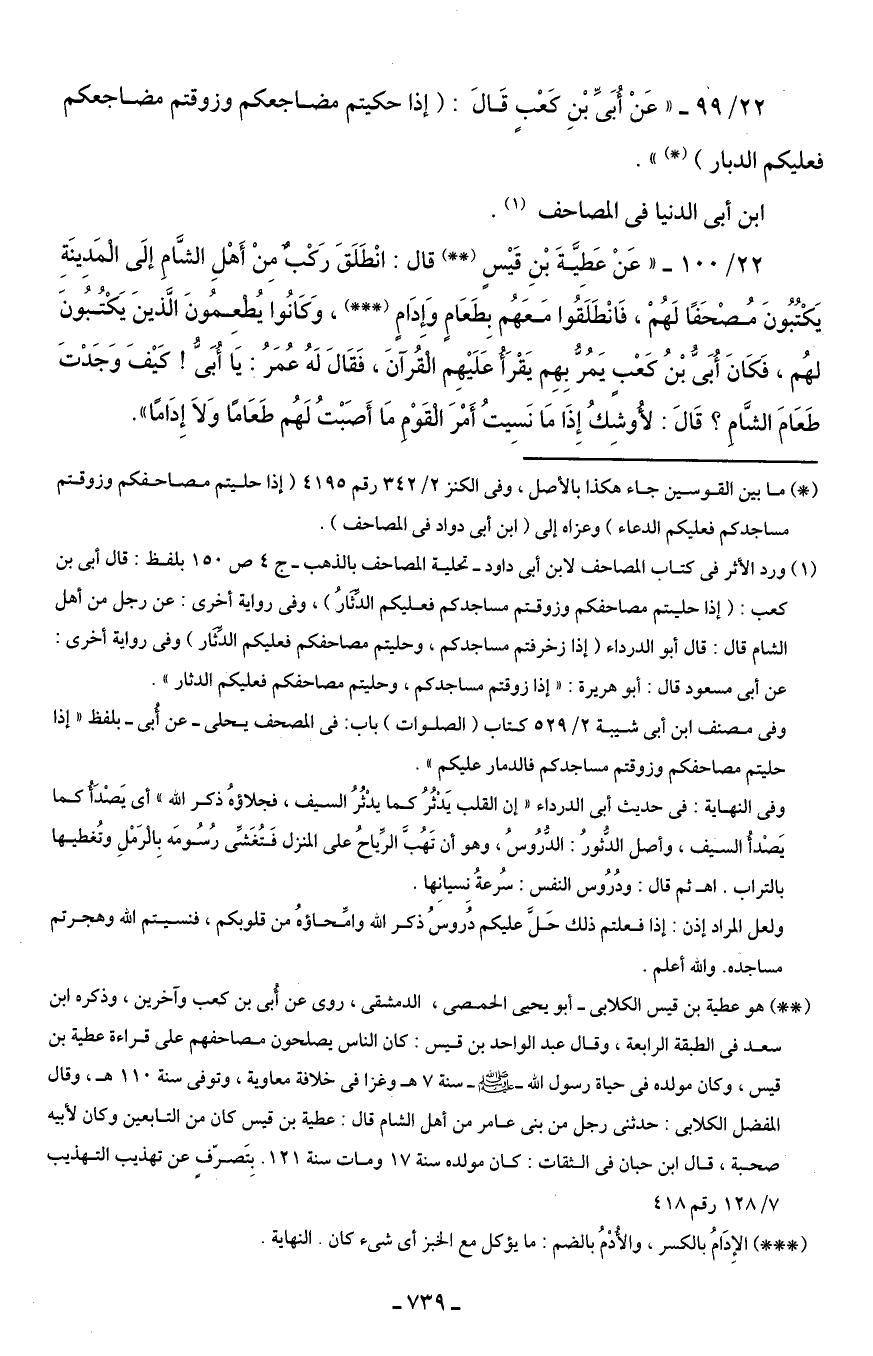 22/ 100 - "عَنْ عَطِيَّةَ بْنِ قَيْسٍ (* *) قال: انْطَلَقَ رَكْبٌ مِنْ أَهْلِ الشَّامِ إلَى الْمَدِينَةِ يَكْتُبُونَ مُصْحَفًا لَهُمْ، فَانْطَلَقُوا مَعَهُم بِطَعَامٍ وَإِدَامٍ (* * *)، وَكَانُوا يُطْعِمُونَ الَّذينَ يَكْتُبُونَ لهُم، فَكَانَ أُبَىُّ بْنُ كَعْبٍ يَمُرُّ بِهِم يَقْرَأُ عَلَيْهِم الْقُرآنَ، فَقَالَ لَهُ عُمَرُ: يَا أُبَىُّ! كَيْفَ وَجَدْتَ طَعَامَ الشَّامِ؟ قَالَ: لأُوشِكُ إِذَا مَا نَسِيتُ أَمْرَ الْقَوْمِ مَا أَصَبْتُ لَهُم طَعَامًا وَلاَ إِدَامًا".
