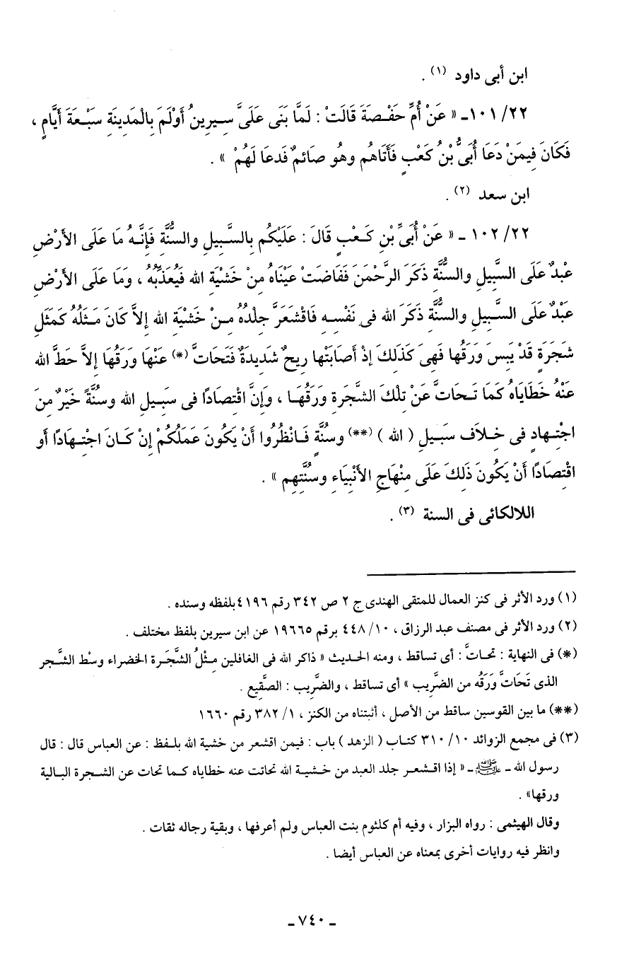 22/ 102 - "عَنْ أُبَىِّ بْنِ كَعْبٍ قَالَ: عَلَيْكُم بِالسَّبِيلِ والسُّنَّةِ فَإِنَّهُ مَا عَلَى الأَرْضِ عْبدٌ عَلَى السَّبِيلِ والسُّنَّةِ ذَكَرَ الرَّحْمَنَ فَفَاضَتْ عَيْنَاهُ مِنْ خَشْيَةِ الله فَيُعَذِّبُهُ، وَمَا عَلَى الأَرْضِ عَبْدٌ عَلَى السَّبِيلِ والسُّنَّةِ ذَكَرَ الله نَفْسِهِ فَاقْشَعَرَّ جِلْدُهُ مِنْ خَشْيَةِ الله إِلَّا كَانَ مَثَلُهُ كَمَثَلِ شَجَرَةٍ قَدْ يَبِسَ وَرَقُها فَهِىَ كَذَلِكَ إذْ أَصَابَتْها رِيحٌ شَدِيدَةٌ فَتَحَاتَّ (*) عَنْهَا وَرَقُهَا إِلَّا حَطَّ الله عَنْهُ خَطَايَاهُ كَمَا تَحَاتَّ عَنْ تِلْكَ الشَّجَرةِ وَرَقُهَا، وَإِنَّ اقْتِصَادًا في سَبِيلِ الله وسُنَّةً خَيْرٌ مِنَ اجْتِهادٍ في خِلاَف سَبيلِ (الله) (* *) وسُنَّةٍ فَانْظُرُوا أَنْ يَكُونَ عَمَلُكُمْ إِنْ كَانَ اجْتِهَادًا أَو اقْتِصَادًا أَنْ يَكُونَ ذَلِكَ عَلَى مِنْهَاجِ الأَنْبِيَاءِ وسُنَّتِهِم".