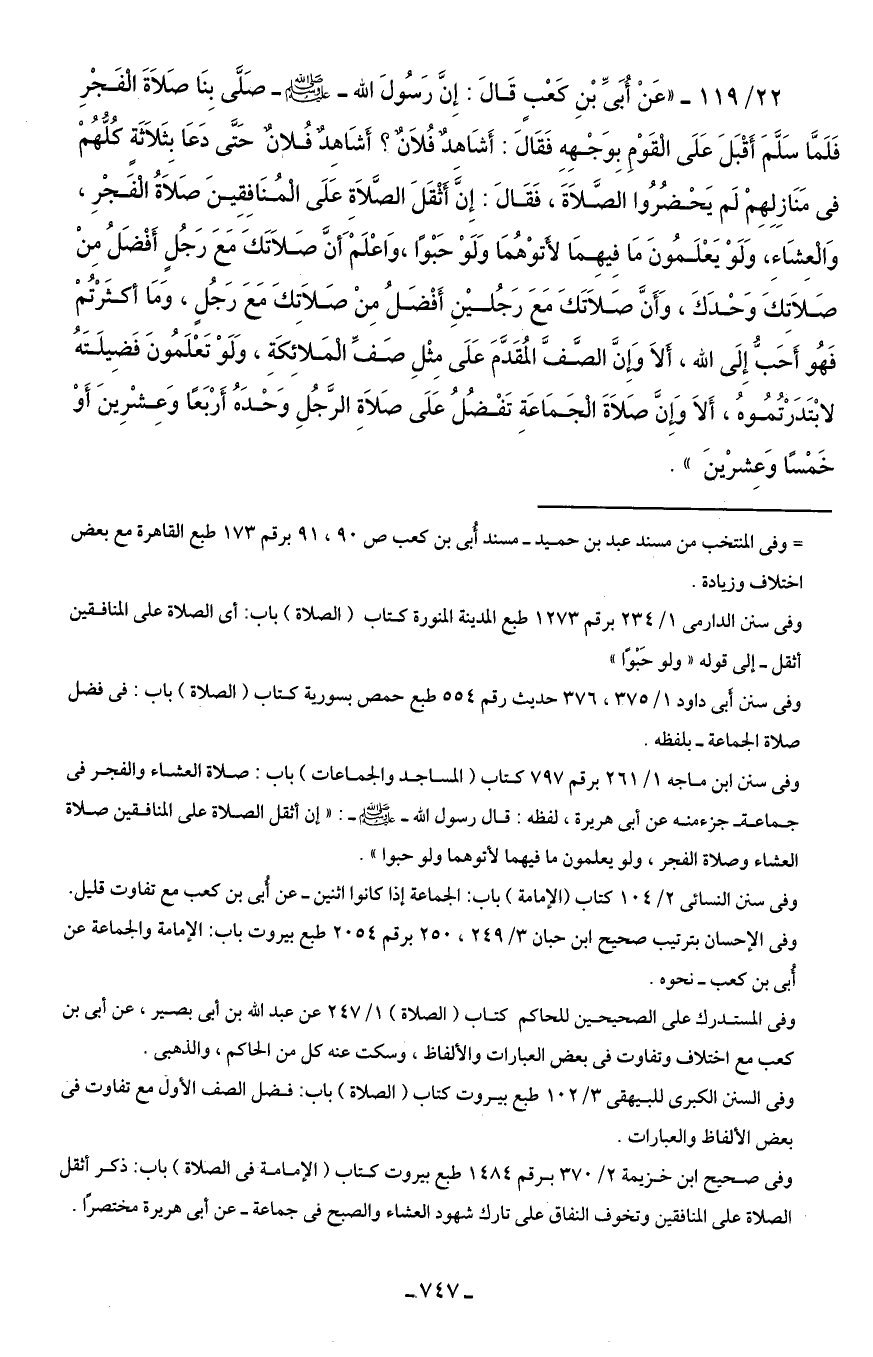 22/ 119 - "عَنْ أُبَىِّ بْنِ كَعْب قَالَ: إِنَّ رَسُولَ الله - صلى الله عليه وسلم - صَلَّى بِنَا صَلاَةَ الْفَجْرِ فَلَمَّا سَلَّمَ أَقْبَلَ عَلَى الْقَوْمِ بِوَجْهِهِ فَقَالَ: أَشَاهِدٌ فُلاَنٌ؟ أَشَاهِدٌ فُلانٌ حَتَّى دَعَا بِثَلاَثَة كُلُّهُمْ في مَنَازِلِهِمْ لَم يَحْضُرُوا الصَّلاَةَ، فَقَالَ: إِنَّ أَثْقَلَ الصَّلاَةِ عَلَى الْمُنَافِقِينَ صَلاَةُ الْفَجْرِ، وَالْعِشَاءِ، وَلَوْ يَعْلَمُونَ مَا فِيهِمَا لأَتوْهُمَا وَلَوْ حَبْوًا، وَاعْلَمْ أَنَّ صَلاَتَكَ مَعَ رَجُلٍ أَفْضَلُ مِنْ صَلاَتِكَ وَحْدَكَ، وَأَنَّ صَلاَتَكَ مَعَ رَجُليْنِ أَفْضَلُ مِنْ صَلاَتِكَ مَعَ رَجُلٍ، وَمَا أكثَرْتُمْ فَهُو أَحَبُّ إِلَى الله، أَلاَ وَإِنَّ الصَّفَّ المُقَدَّمَ عَلَى مِثْلِ صَفِّ الْمَلائِكَةِ، وَلَوْ تَعْلَمُونَ فَضِيلَتَهُ لابْتَدَرْتُمُوهُ، أَلاَ وَإِنَّ صَلاَةَ الْجَمَاعَةِ تَفْضُلُ عَلَى صَلاَةِ الرَّجُلِ وَحْدَهُ أَرْبَعًا وَعِشْرِينَ أَوْ خَمْسًا وَعِشرْينَ".