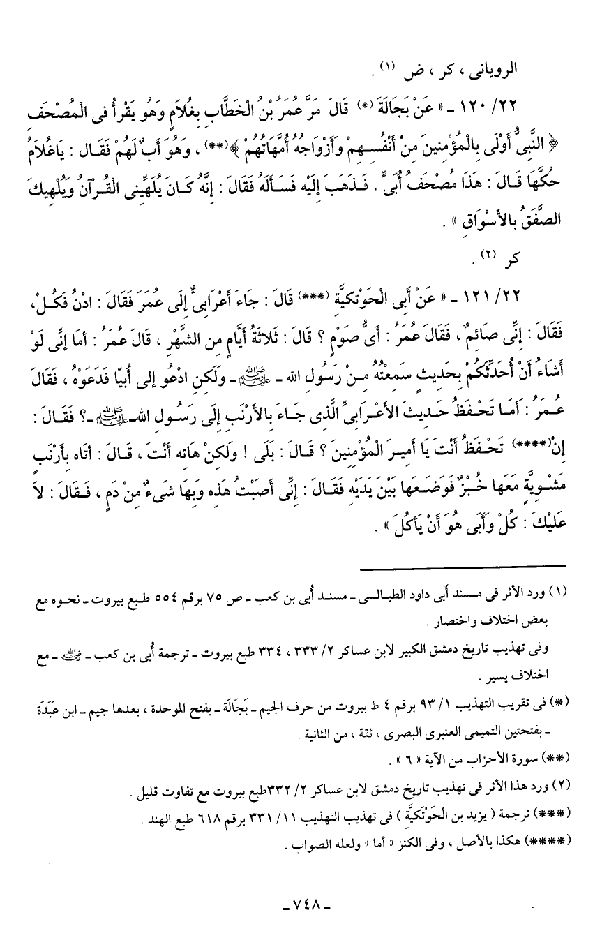 22/ 120 - "عَنْ بَجَالَةَ (*) قَالَ مَرَّ عُمَرُ بْنُ الْخَطَّابِ بِغُلاَمٍ وَهُو يَقْرأُ في الْمُصْحَفِ {النَّبِيُّ أَوْلَى بِالْمُؤْمِنِينَ مِنْ أَنْفُسِهِمْ وَأَزْوَاجُهُ أُمَّهَاتُهُمْ} (*)، وَهُوَ أَبٌ لَهُمْ فَقَال: يَا غُلاَمُ حُكَّهَا قَالَ: هَذَا مُصْحَفُ أُبَىٍّ. فَذَهَبَ إِلَيْه فَسَأَلَهُ فَقَالَ: إِنَّهُ كَانَ يُلَهِّيِنى الْقُرْآنُ وَيُلْهِيكَ الصَّفَقُ بالأَسْوَاقِ".