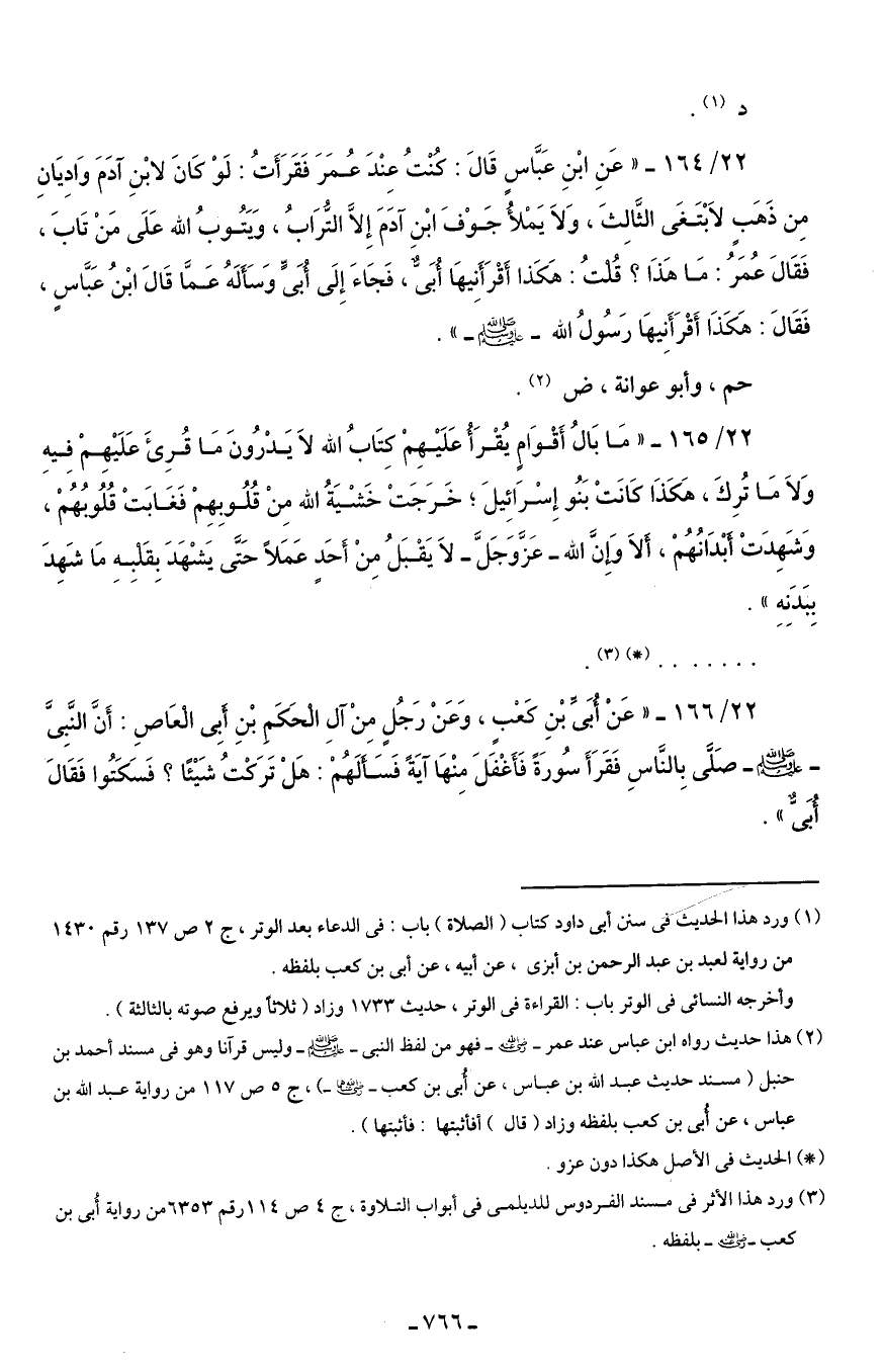 22/ 164 - "عَنِ ابْنِ عَبَّاسٍ قَالَ: كُنْتُ عِنْدَ عُمَرَ فَقَرَأَتُ: لَوْ كَانَ لابْنِ آدَمَ وَادِيَانِ مِن ذَهَبٍ لاَبْتَغَى الثَّالِثَ، وَلاَ يَمْلأُ جَوْفَ ابْنِ آدَمَ إِلاَّ التُّرَابُ، وَيَتُوبُ الله عَلَى مَنْ تَابَ، فَقَالَ عُمَرُ: مَا هَذَا؟ قُلْتُ: هَكَذا أَقْرَأَنِيهَا أُبَىٌّ، فَجَاءَ إِلَى أُبَىٍّ وَسَأَلَهُ عَمَّا قَالَ ابْنُ عَبَّاسٍ، فَقَالَ: هَكَذَا أَقْرَأَنِيهَا رَسولُ الله - صلى الله عليه وسلم - ".