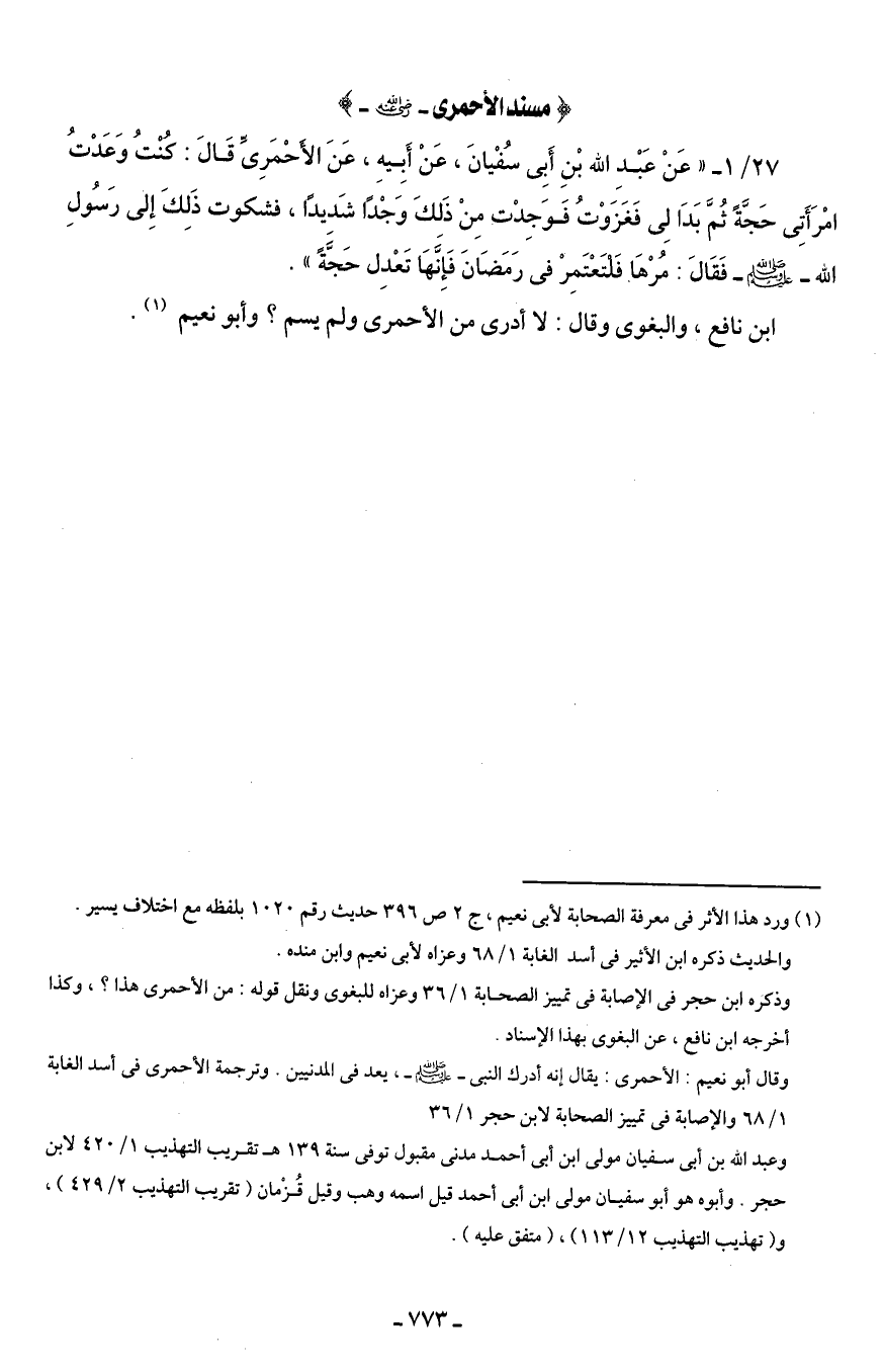 27/ 1 - " عَنْ عَبْدِ الله بْنِ أَبِى سُفْيانَ، عَنْ أَبِيهِ، عَنَ الأَحْمَرِىِّ قَالَ: كُنْتُ وَعَدْتُ امْرَأَتِى حَجَّةً ثُمَّ بَدَا لِى فَغَزَوْتُ فَوَجِدْت مِنْ ذَلكَ وَجْدًا شَدِيدًا، فشكوت ذَلِكَ إِلى رَسُولِ الله - صلى الله عليه وسلم - فَقَالَ: مُرْهَا فَلتَعْتَمِرْ في رَمَضَانَ فَإِنَّهَا تَعْدِل حَجَّةً".