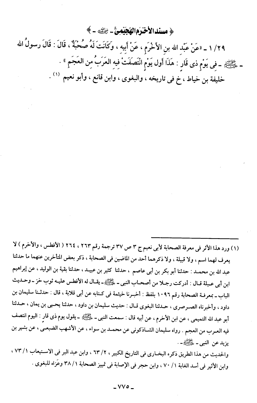 29/ 1 - " عَنْ عَبْدِ الله بنِ الأَخْرَمِ، عَنْ أَبِيهِ، وَكانَتَ لَهُ صُحْبَةٌ، قَالَ: قَالَ رسولُ الله - صلى الله عليه وسلم - فِى يَوْمِ ذى قَارٍ: هَذَا أَول يَوْمٍ انْتَصَفَتْ فِيهِ العَرَبُ مِن العَجَمِ".