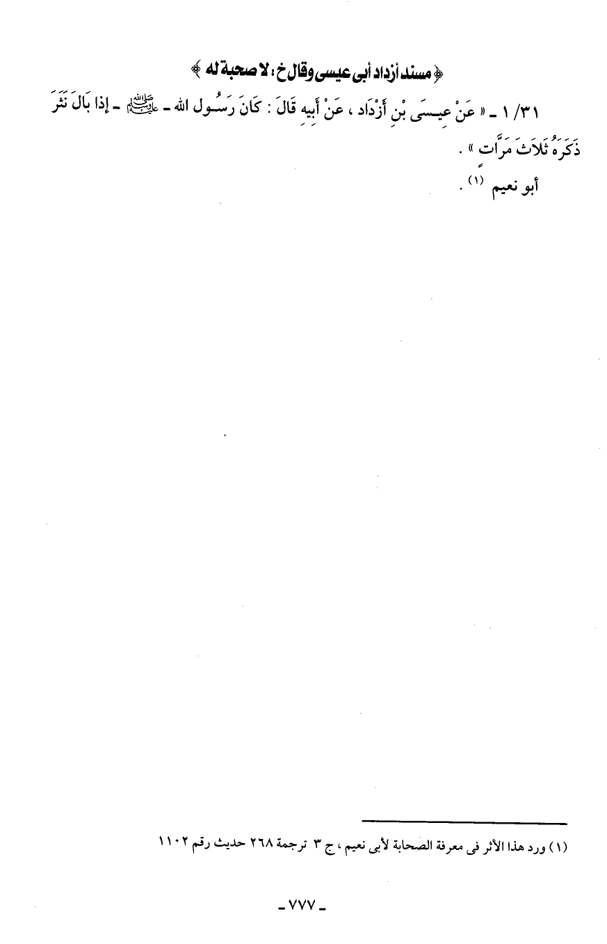 31/ 1 - " عَنْ عِيسَى بْنِ أَزْدَاد، عَنْ أَبِيهِ قَالَ: كَانَ رَسُول الله - صلى الله عليه وسلم - إِذَا بَالَ نَثَرَ ذَكَرَهَ ثَلَاثَ مَرَّاتٍ".