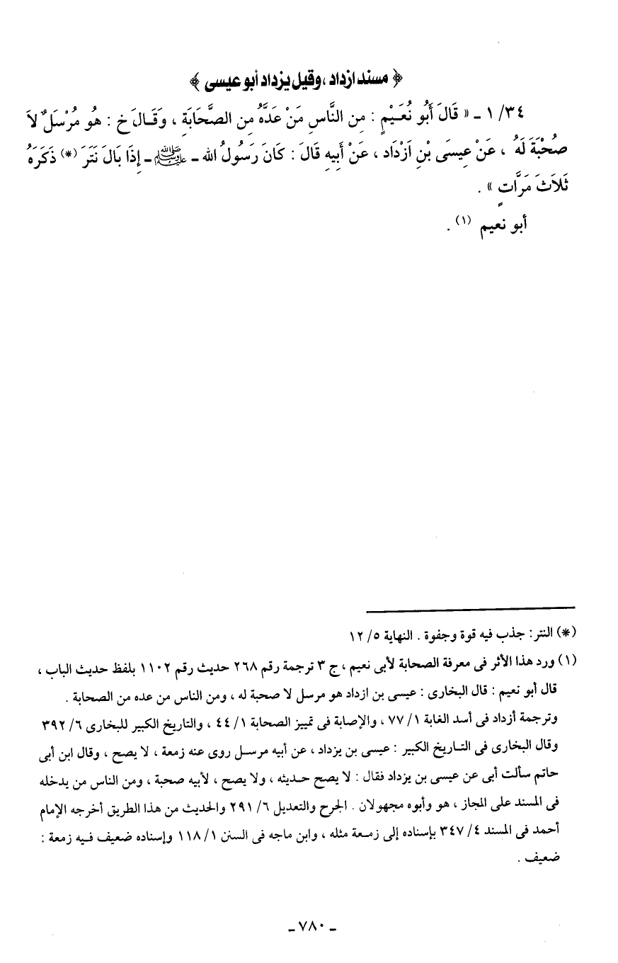 34/ 1 - " قَالَ أَبُو نُعَيْمٍ: مِن النَّاسِ مَنْ عَدَّهُ مِن الصَّحَابَةِ، وَقَالَ خ: هُو مُرْسَل لَا صُحْبَةَ لَهُ، عَنْ عِيسَى بْنِ اَزْدَاد، عَنْ أَبِيهِ قَالَ: كَانَ رَسُولُ الله - صلى الله عليه وسلم - إِذَا بَالَ نَتَرَ (*) ذَكَرَهُ ثَلَاثَ مَرَّاتٍ".