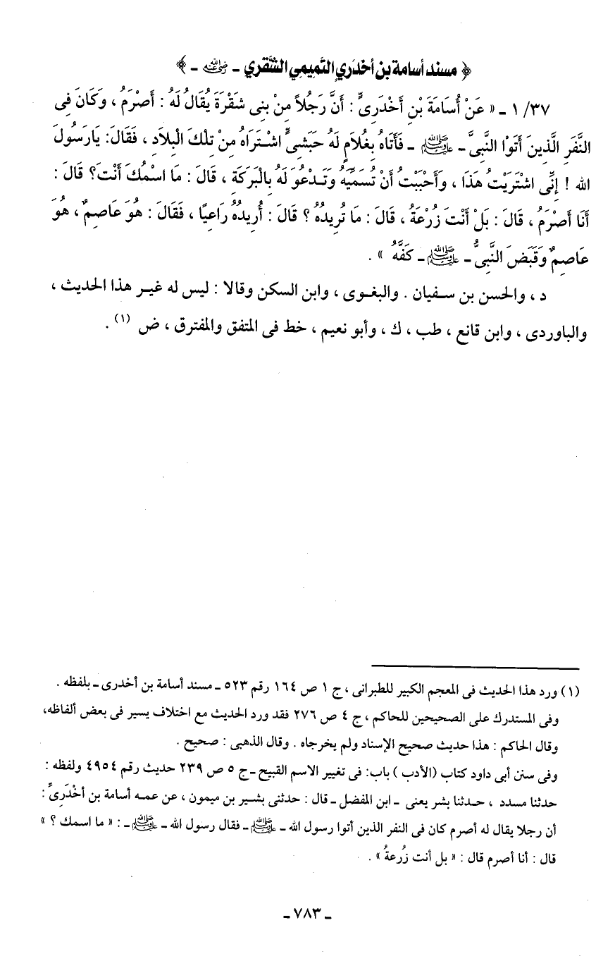 37/ 1 - " عَنْ أُسَامَةَ بْنِ أَخْدَرِىٍّ: أَنَّ رَجُلًا منْ بنِى شَقْرَةَ يُقَالُ لَهُ: أَصْرَمُ، وَكَانَ فِى النَّفَرِ الَّذِينَ أَتَوْا النَّبِىَّ - صلى الله عليه وسلم - فَأَتَاهُ بِغُلَامٍ لَهُ حَبَشِىٍّ اشْتَرَاهُ مِنْ تِلْكَ الْبِلَادِ، فَقَالَ: يَا رَسُولَ الله! إِنِّى اشْتَرَيْتُ هَذَا، وَأَحْبَبْتُ أَنْ تُسَمِّيَهُ وَتَدْعُوَ لَهُ بِالْبَرَكَةِ، قَالَ: مَا اسْمُكَ أَنْتَ؟ قَالَ: أَنَا أَصْرَمُ، قَالَ: بَلْ أَنْتَ زُرْعَةُ، قَالَ: مَا تُرِيدُهُ؟ قَالَ: أُرِيدُهُ رَاعِيًا، فَقَالَ: هُوَ عَاصِمٌ، هُوَ عَاصِمٌ وَقَبَضَ النَّبِىُّ - صلى الله عليه وسلم - كَفَّهُ".