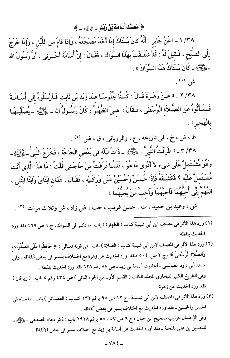38/ 1 - " عَنْ جَابِر: أَنَّهُ كَانَ يَسْتَاكُ إِذَا أَخَذَ مَضْجَعَهُ، وَإذَا قَامَ مِن اللَّيْلِ، وَإذَا خَرَجَ إِلَى الصُّبْح، فَقِيلَ لَهُ: قَدْ شَقَقْتَ بِهَذَا السِّوَاكِ، فَقَالَ: إِنَّ أُسَامَةَ أَخْبَرَنِى: أَنَّ رَسُولَ الله - صلى الله عليه وسلم - كَانَ يَسْتَاكُ هَذَا السِّوَاكَ".