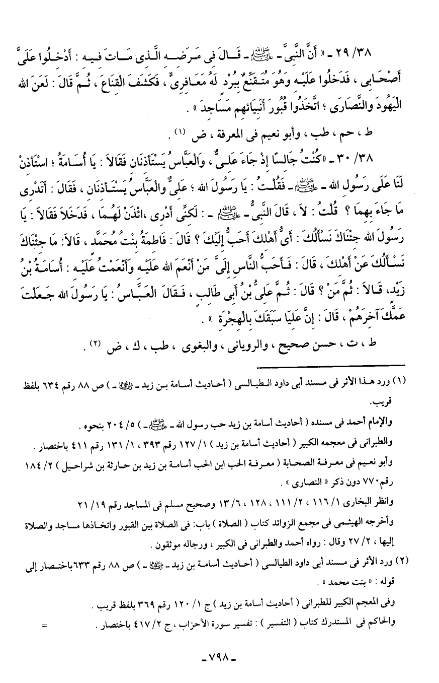 38/ 29 - "أَنَّ النَّبِىَّ - صلى الله عليه وسلم - قَالَ فِى مَرَضِهِ الَّذِى مَاتَ فِيهِ: أَدْخِلُوا عَلَىَّ أَصْحَابِى، فَدَخلُوا عَلَيْهِ وَهُوَ مُتَقَنِّع بِبُرْد لَهُ مَعَافِرِىٍّ، فَكَشَفَ الْقِنَاعَ، ثُمَّ قَالَ: لَعَنَ الله الْيَهُودَ والنَّصَارَى؛ اتَّخَذُوا قُبُورَ أَنَبِيَائهِم مَسَاجِدَ".