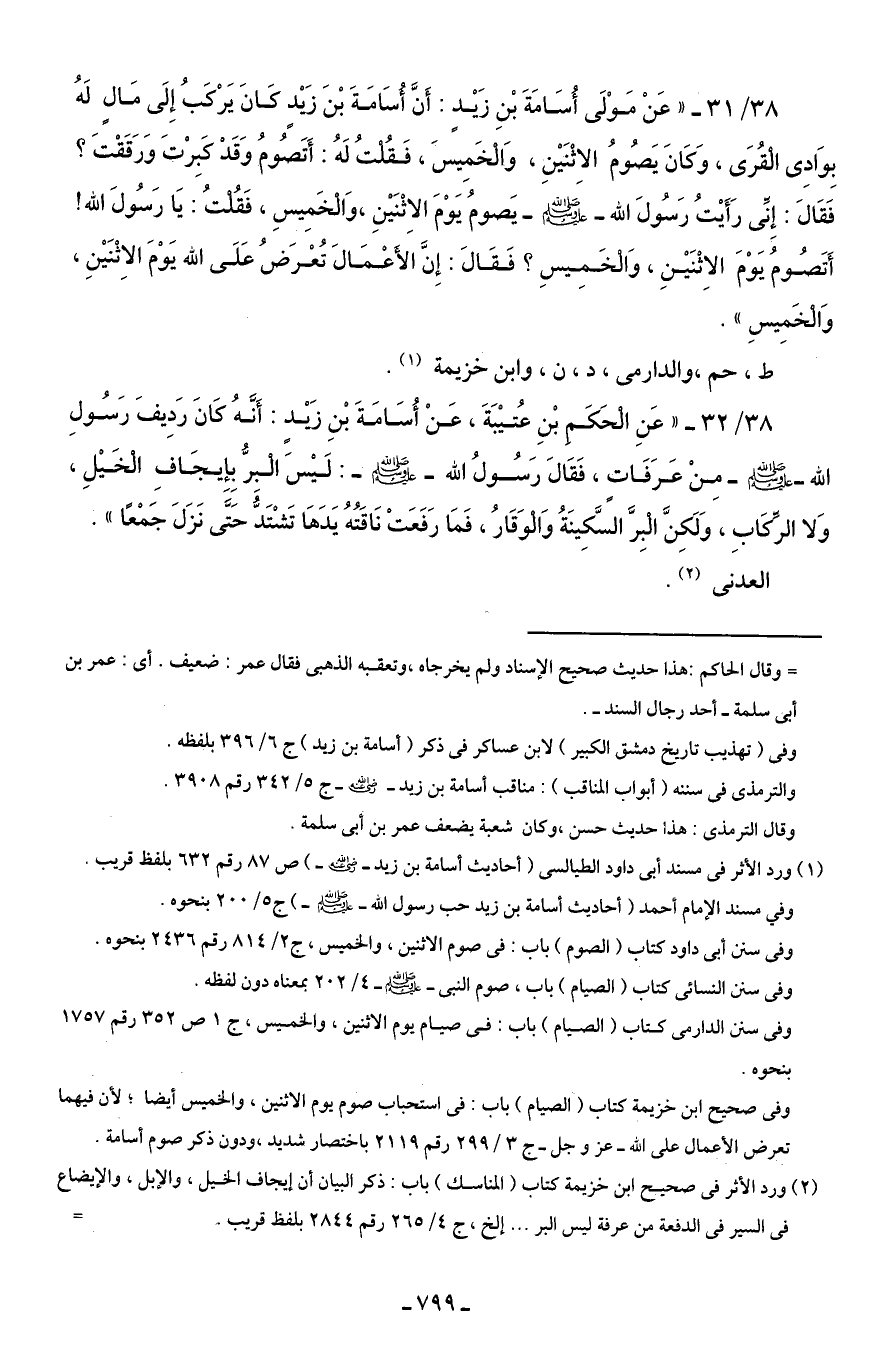 38/ 31 - "عَنْ مَوْلَى أُسَامَةَ بْنِ زَيْدٍ: أَنَّ أُسَامَةَ بْنَ زَيْدٍ كَانَ يَرْكَبُ إِلَى مَالٍ لَهُ بِوَادِى الْقُرَى، وَكَانَ يَصُومُ الاثْنَيْنِ، وَالْخَمِيسَ، فَقُلتُ لَهُ: أَتَصُومُ وَقَدْ كبِرْتَ وَرَقَقْتَ؟ فَقَالَ: إِنِّى رَأَيْتُ رَسُولَ الله - صلى الله عليه وسلم - يَصومُ يَوْمَ الِاثْنَيْنِ، وَالْخَمِيسِ، فَقُلتُ: يَا رَسُولَ الله! أَتَصُومُ يَوْمَ الِاثْنَيْنِ، وَالْخَمِيسِ؟ فَقَالَ: إِنَّ الأعْمَالَ تُعْرَضُ عَلَى الله يَوْمَ الِاثْنَيْنِ، وَالْخَمِيسِ".