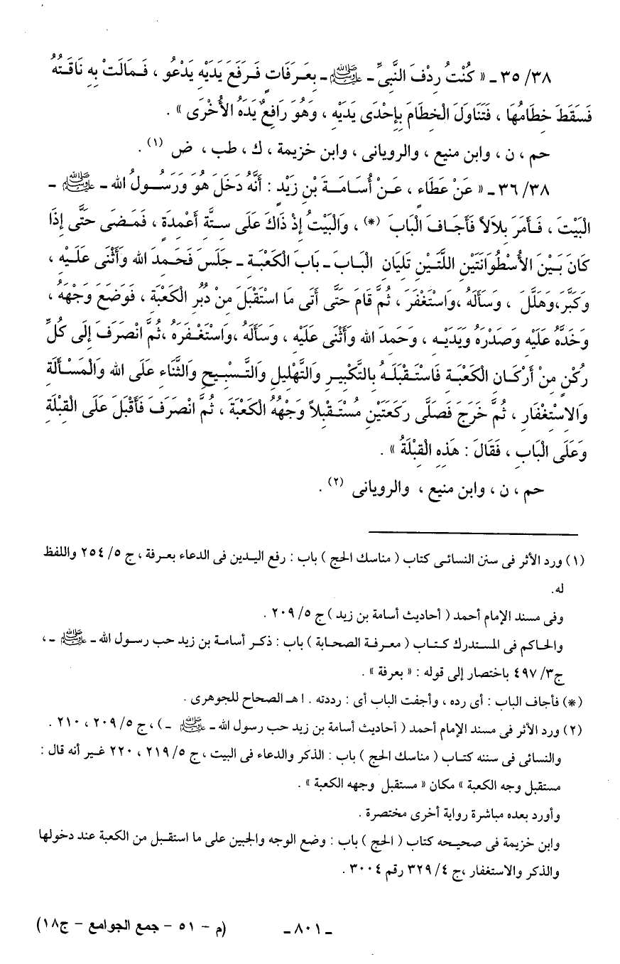 38/ 36 - "عَنْ عَطَاء، عَنْ أُسَامَةَ بْنِ زَيْدٍ: أَنَّهُ دَخَلَ هُوَ وَرَسُولُ الله - صلى الله عليه وسلم - الْبَيْتَ، فَأَمَرَ بِلَالًا فَأَجَافَ الْبَابَ (3)، وَالْبَيْتُ إِذْ ذَاكَ عَلَى لسِتَّةِ أَعْمِدَة، فَمَضَى حَتَّى إِذَا كَانَ بَيْنَ الأُسْطُوَانَتَيْنِ اللَّتَيْنِ تَلِيَانِ الْبَابَ - بَابَ الْكَعْبَةِ - جَلَسَ فَحَمَدَ الله وَأَثْنَى عَلَيْهِ، وَكَبَّرَ، وَهَلَّلَ، وَسَأَلَهُ، وَاسْتَغْفَرَ، ثُمَّ قَامَ حَتَّى أَتَى مَا اسْتَقْبَلَ مِنْ دُبُرِ الْكَعْبَة، فَوَضَعَ وَجْهَهُ، وَخَدَّهُ عَلَيْهِ وَصَدْرَهُ وَيَدَيْهِ، وَحَمِدَ الله وَأَثْنَى عَلَيْهِ، وَسَأَلَهُ، وَاسْتَغْفَرَهُ، ثُمَّ انْصَرَفَ إِلَى كُلِّ رُكْنٍ مِنْ أَرْكَانِ الْكَعْبَةِ فَاسْتَقْبَلَهُ بِالتَّكْبِيرِ وَالتَّهْلِيلِ وَالتَّسْبِيح وَالثَّنَاءِ عَلَى الله وَالْمَسْأَلَةِ وَالاِسْتِغْفَارِ، ثُمَّ خَرَجَ فَصَلَّى رَكَعَتَيْنِ مُسْتَقْبِلًا وَجْهُهُ الْكَعْبَةَ، ثُمَّ انْصَرَفَ فَأَقْبَلَ عَلَى الْقِبْلَةِ وَعَلَى الْبَابِ، فَقَالَ: هَذِهِ الْقِبْلَةُ".