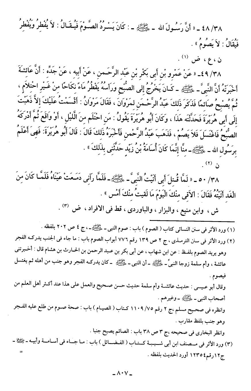 38/ 49 - "عَنْ عَمْرِو بْنِ أَبِى بَكْرِ بْنِ عَبْدِ الرَّحَمنِ، عَنْ أَبِيهِ، عَنْ جَدِّهِ: أَنَّ عَائِشَةَ أَخْبَرَتْهُ أَنَّ النَّبِىَّ - صلى الله عليه وسلم - كَانَ يَخْرُجُ إِلى الصُّبْح وَرَأسُهُ يَقْطُرُ مَاءً نِكَاحًا منْ غَيْرِ احْتِلاَمٍ، ثمَّ يُصْبِح صَائِمًا فَذَكَرَ ذَلِكَ عَبْدُ الرَّحْمَنِ لِمَرْوَانَ، فَقَالَ مَرْوَانُ: أَقْسَمْتُ عَلَيْكَ إِلاَّ ذَهَبْتَ إِلَى أَبِى هرَيْرَةَ فَحَدَّثْتَه هَذَا، وَكَانَ أَبو هرَيْرَةَ يَقُولُ: مَنِ احْتَلَم مِنَ الَّليْلِ، أَوْ وَاقَعَ ثمَّ أَدْرَكَهُ الصُّبْح فَاغْتَسَلَ فَلاَ يَصُمْ، فَذَهَبَ عَبْدُ الرَّحْمنِ فَأَخْبَرَهُ ذَلِكَ قَالَ: قَالَ أَبُو هُرَيْرَةَ: فَهِىَ أَعْلَمُ بِرَسُولِ الله - صلى الله عليه وسلم - مِنَّا إِنَّمَا كَانَ أُسَامَةُ بْن زيدٍ حَدَّثَنِى بِذَلِكَ".