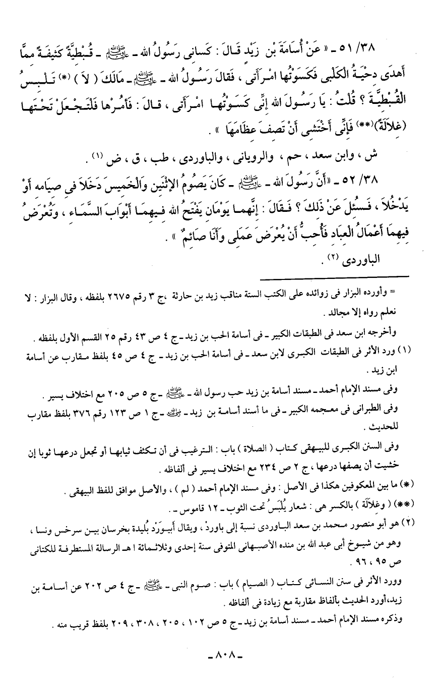 38/ 51 - "عَنْ أُسَامَةَ بْن زَيْدٍ قَالَ: كَسانِى رَسُولُ الله - صلى الله عليه وسلم - قُبْطِيَّةً كَتيفَةً ممَّا أَهدَى دحْيَةُ الْكَلبى فَكَسَوْتُها امْرَأَتى، فَقالَ رَسُولُ الله - صلى الله عليه وسلم - مَالَكَ (لاَ) (*) تَلبِسُ الْقُبْطِيَّةَ؟ قُلتُ: يَا رَسُولَ الله إِنِّى كَسَوْتُها امْرَأَتى، قالَ: فَأمُرْها فَلتَجْعَلْ تَحْتَها (غِلاَلَةً) (* *) فَإِنِّى أَخْتَشِى أَنْ تَصِفَ عِظَامَهَا".