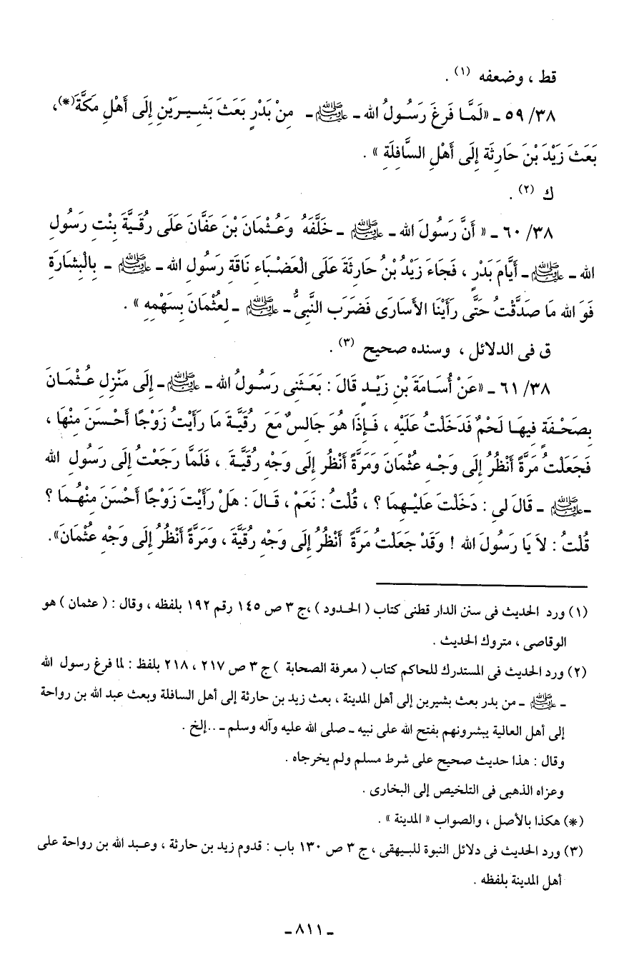38/ 61 - "عَنْ أُسَامَةَ بْنِ زَيْدٍ قَالَ: بَعَثَنِى رَسُولُ الله - صلى الله عليه وسلم - إِلَى مَنْزِلِ عُثْمَانَ بِصَحْفَة فِيهَا لَحْمٌ فَدَخَلتُ عَلَيْهِ، فَإِذَا هُوَ جَالِسٌ مَعَ رُقَيَّةَ مَا رَأَيْتُ زَوْجًا أحْسَنَ مِنْهَا، فَجَعَلتُ مَرَّةً أَنْظُرُ إِلَى وَجْهِ عُثْمَانَ وَمَرَّةً أَنْظُر إِلَى وَجْهِ رُقَيَّةَ، فَلَمَّا رَجَعْتُ إِلَى رَسُولِ الله - صلى الله عليه وسلم - قَالَ لي: دَخَلتَ عَليْهِمَا؟ ، قُلتُ: نَعَمْ، قَالَ: هَلْ رَأَيْتَ زَوْجًا أَحْسَنَ منْهُمَا؟ قُلتُ: لاَ يَا رَسُولَ الله! وَقَدْ جَعَلتُ مَرَّةً أَنْظُرُ إِلَى وَجْهِ رُقَيَّةَ، وَمَرَّةً أَنْظُرُ إِلَى وَجْهِ عَثْمَانَ".