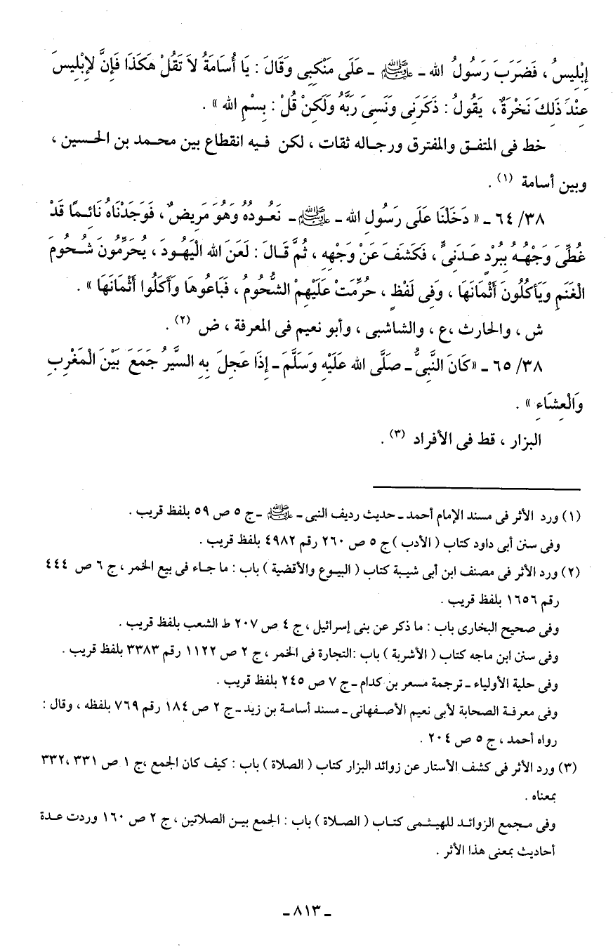 38/ 64 - "دَخَلنَا عَلَى رَسُولِ الله - صلى الله عليه وسلم - نَعُودُهُ وَهُوَ مَرِيضٌ، فَوَجَدْنَاهُ نَائِمًا قَدْ غُطِّىَ وَجْهُهُ بِبُرْد عَدَنِىٍّ، فَكَشَفَ عَنْ وَجْهِهِ، ثُمَّ قَالَ: لَعَنَ الله الْيَهُودَ، يُحَرِّمُونَ شُحُومَ الْغَنَم وَيَأكلُونَ أَثْمَانَهَا، وَفِى لَفْظٍ، حُرِّمَتْ عَلَيْهِمْ الشُّحُومُ، فَبَاعُوهَا وَأَكَلُوا أَثْمَانَهَا".