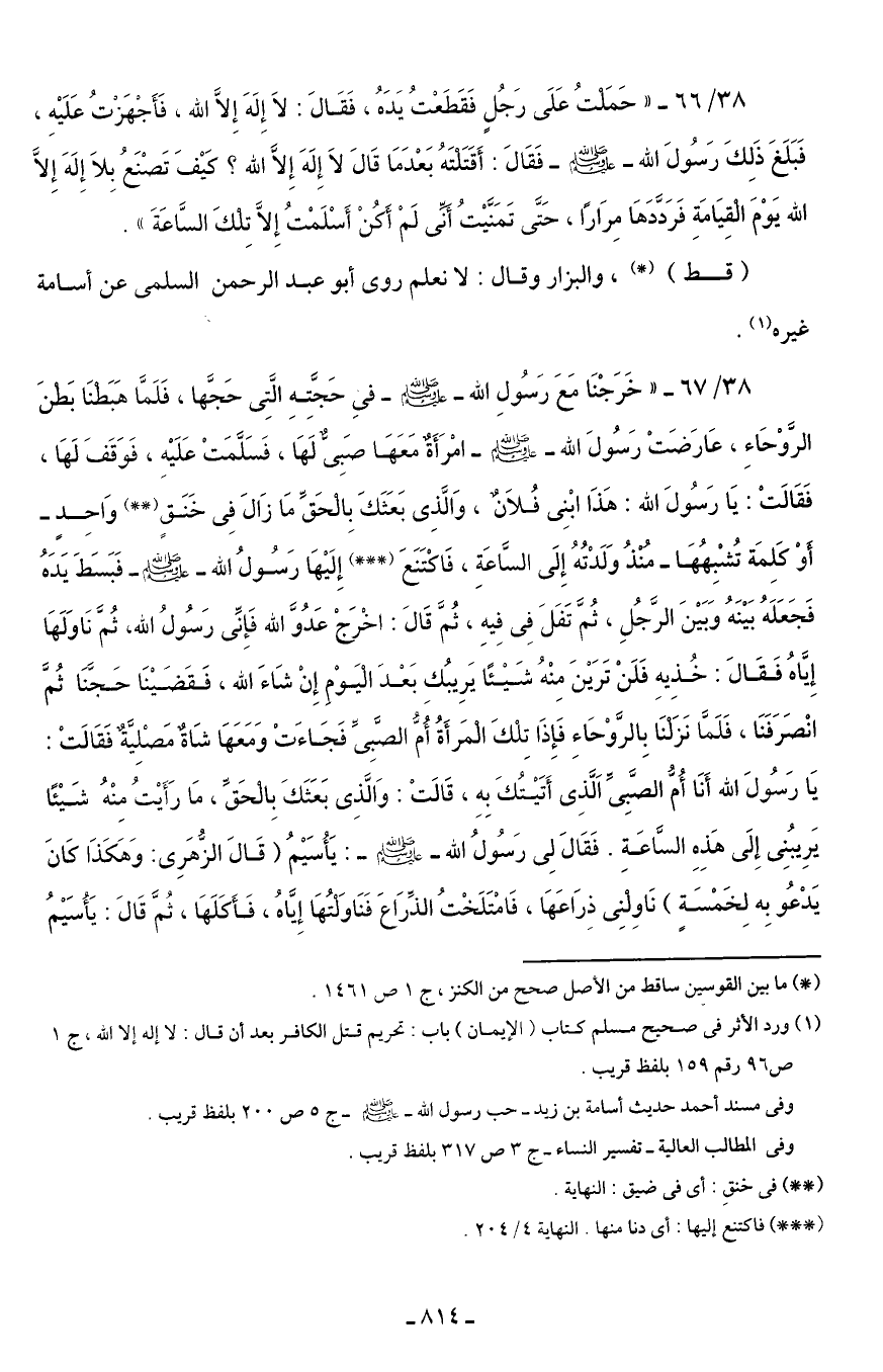 38/ 66 - "حَمَلتُ عَلَى رَجُلٍ فَقَطَعْتُ يَدَهُ، فَقَالَ: لاَ إِلَهَ إِلاَّ الله، فَأَجْهَزتُ عَلَيْهِ، فَبَلَغَ ذَلِكَ رَسُولَ الله - صلى الله عليه وسلم - فَقَالَ: أَقَتَلتَهُ بَعْدَمَا قَالَ لاَ إِلَهَ إِلَّا الله؟ كَيْفَ تَصْنَعُ بِلاَ إِلَهَ إِلاَّ الله يَوْمَ الْقِيَامَةِ فَرَدَّدَهَا مِرَارًا، حَتَّى تَمَنَيْتُ أَنّى لَمْ أَكُنْ أَسْلَمْتُ إِلاَّ تِلكَ السَّاعَةَ".