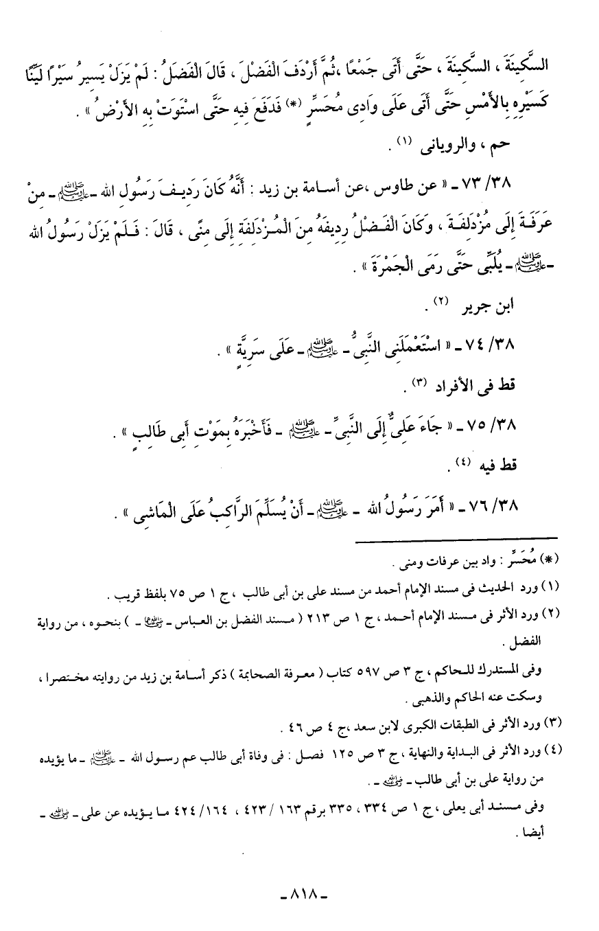 38/ 73 - "عن طاوس، عن أسامة بن زيد: أَنَّهُ كانَ رَدِيفَ رَسُولِ الله - صلى الله عليه وسلم - مِنْ عَرَفَةَ إِلَى مُزْدَلِفَةَ، وَكانَ الْفَضْلُ رِدِيفَهُ مِنَ الْمُزْدَلِفَةِ إِلَى مِنًى، قَالَ: فَلَمْ يَزَلْ رَسُولُ الله - صلى الله عليه وسلم - يُلَبِّى حَتَّى رَمَى الْجَمْرَةَ".