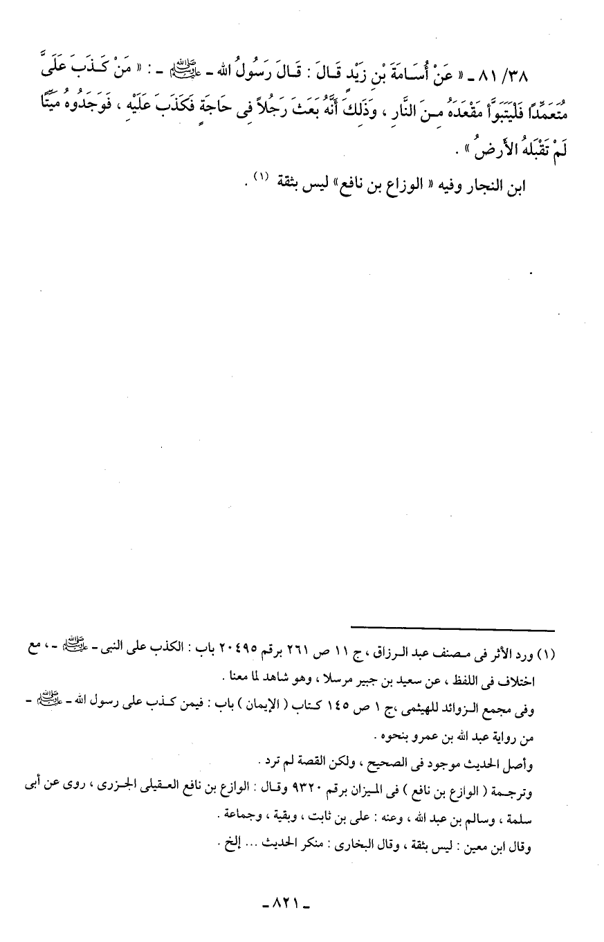 38/ 81 - "عَنْ أُسَامَةَ بْنِ زَيْد قَالَ: قَالَ رَسُولُ الله - صلى الله عليه وسلم -: "مَنْ كَذَبَ عَلَىَّ مُتَعَمِّدًا فَليَتَبَوَّأ مَقْعَدَهُ مِنَ النَّارِ، وَذَلِكَ أَنَّهُ بَعَثَ رَجُلًا فِى حَاجَةٍ فَكَذَبَ عَلَيْهِ، فَوَجَدُوهُ مَيِّتًا لَمْ تَقْبَلهُ الأَرضُ".