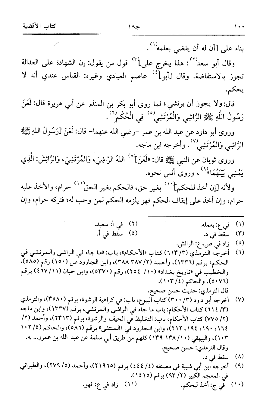 قال: ولا يجوز أن يرتشي؛ لما روى أبو بكر بن المنذر عن أبي هريرة قال: لَعَنَ رَسُولُ اللهِ صلى الله عليه وسلم الرَّاشِي وَالْمُرْتَشِي فِي الْحُكْمِ.