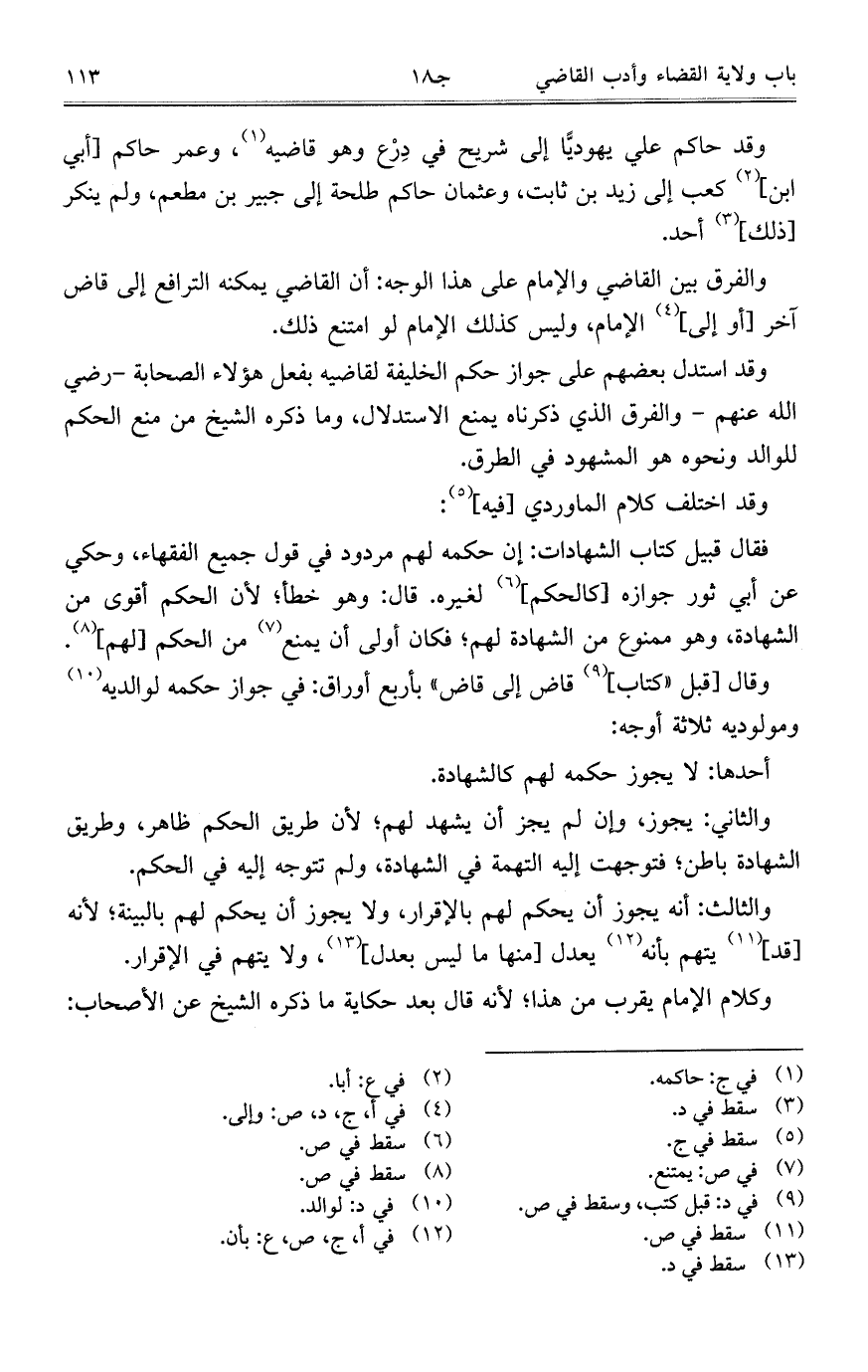 وقد حاكم علي يهوديّاً إلى شريح في دِرْع وهو قاضيه، وعمر حاكم [أبي ابن] كعب إلى زيد بن ثابت، وعثمان حاكم طلحة إلى جبير بن مطعم، ولم ينكر [ذلك] أحد.