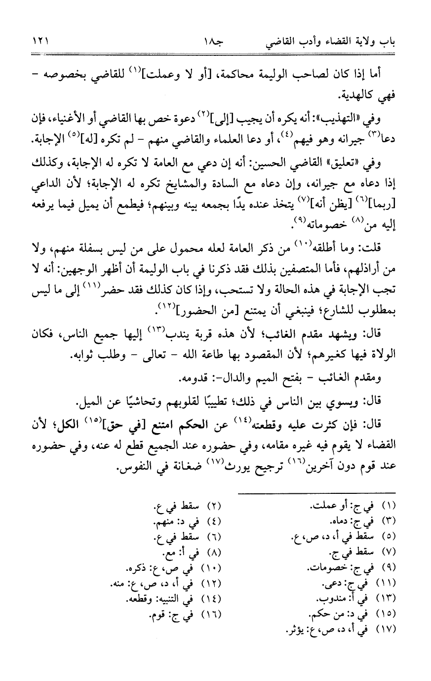 وفي "تعليق" القاضي الحسين: أنه إن دعي مع العامة لا تكره له الإجابة، وكذلك إذا دعاه مع جيرانه، وإن دعاه مع السادة والمشايخ تكره له الإجابة؛ لأن الداعي [ربما] [يظن أنه] يتخذ عنده يداً بجمعه بينه وبينهم؛ فيطمع أن يميل فيما يرفعه إليه من خصوماته.
