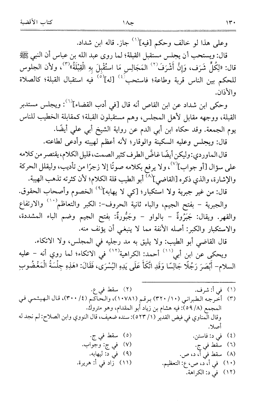 قال: ويستحب أن يجلس مستقبل القبلة؛ لما روى عبد الله بن عباس أن النبي صلى الله عليه وسلم قال: "لِكُلٍّ شَرَف، وَإِنَّ أَشْرَفَ المَجَالِسِ مَا استُقْبِلَ بِهِ الْقِبْلَهُ"، ولأن الجلوس للحكم بين الناس قربة وطاعة؛ فاستحب [له] فيه استقبال القبلة؛ كالصلاة والأذان.