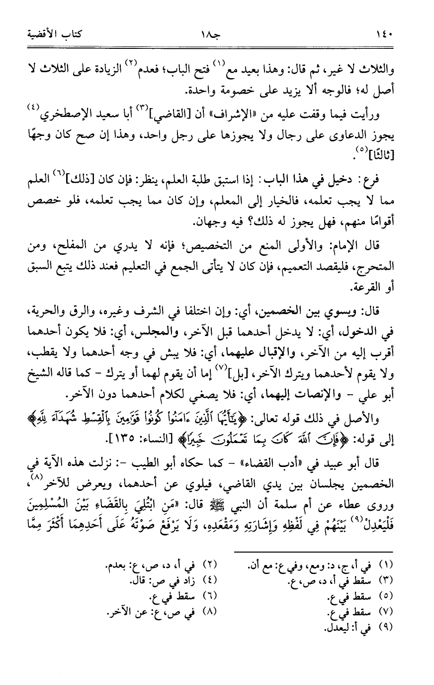 قال أبو عبيد في "أدب القضاء"- كما حكاه أبو الطيب-: نزلت هذه الآية في الخصمين يجلسان بين يدي القاضي، فيلوي عن أحدهما، ويعرض للآخر، وروى عطاء عن أم سلمة أن النبي صلى الله عليه وسلم قال: "مَنِ ابْتُلِيَ بِالقَضَاءِ بَيْنَ المُسْلِمِينَ فَلْيَعْدِلْ بَيْنَهُمْ فِي لَفْظِهِ وَإِشَارَتِهِ وَمَقْعَدِهِ، وَلَا يَرْفَعْ صَوْتَهُ عَلَى أَحَدِهِمَا أَكْثَرَ مِمَّا