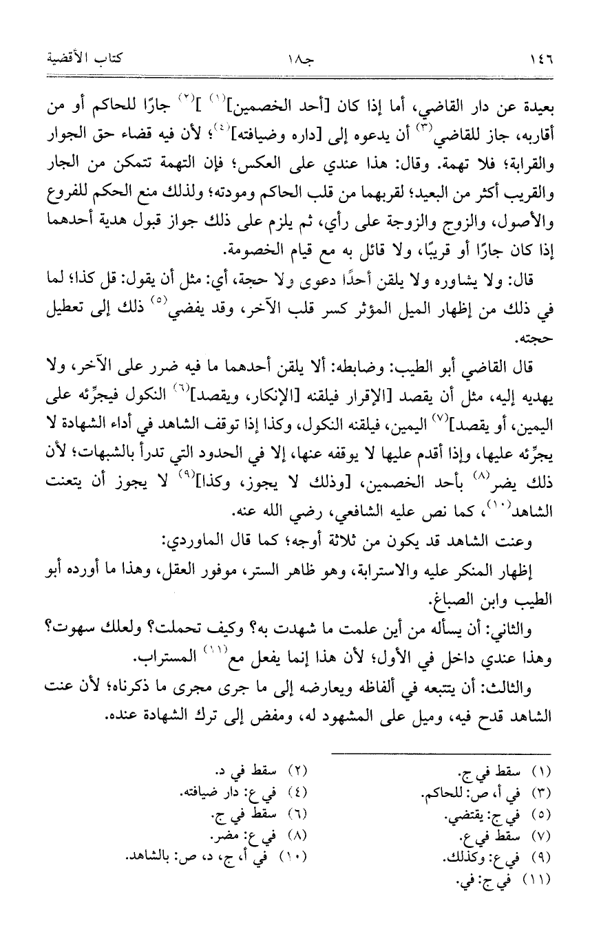 بعيدة عن دار القاضي، أما إذا كان [أحد الخصمين]] جاراً للحامك أو من أقاربه، جاز للقاضي أن يدعوه إلى [داره وضيافته]؛ لأن فيه قضاء حق الجوار والقرابة؛ فلا تهمة. وقال: هذا عندي على العكس؛ فإن التهمة تتمكن من الجار والقريب أكثر من البعيد؛ لقربهما من قلب الحاكم ومودته؛ ولذلك منع الحكم للفروع والأصول، والزوج والزوجة على رأي، ثم يلزم على ذلك جواز قبول هدية أحدهما إذا كان جاراً أو قريباً، ولا قائل به مع قيام الخصومة.