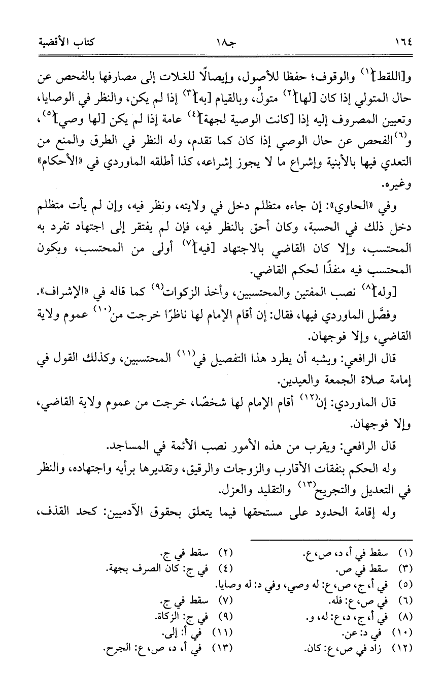 و [اللقط] والوقوف؛ حفظاً للأًول، وإيصالاً للغلات إلى مصارفها بالفحص عن حال المتولي إذا كان [لها] متولٍّ، وبالقيام [به] إذا لم يكن، والنظر في الوصايا، وتعيين المصروف إليه إذا [كانت الوصية لجهة] عامة إذا لم يكن [لها وصي]، والفحص عن حال الوصي إذا كان كما تقدم، وله النظر في الطرق والمنع من التعدي فيها بالأبنية وإشراع ما لا يجوز إشراعه، كذا أطلقه الماوردي في "الأحكام" وغيره.