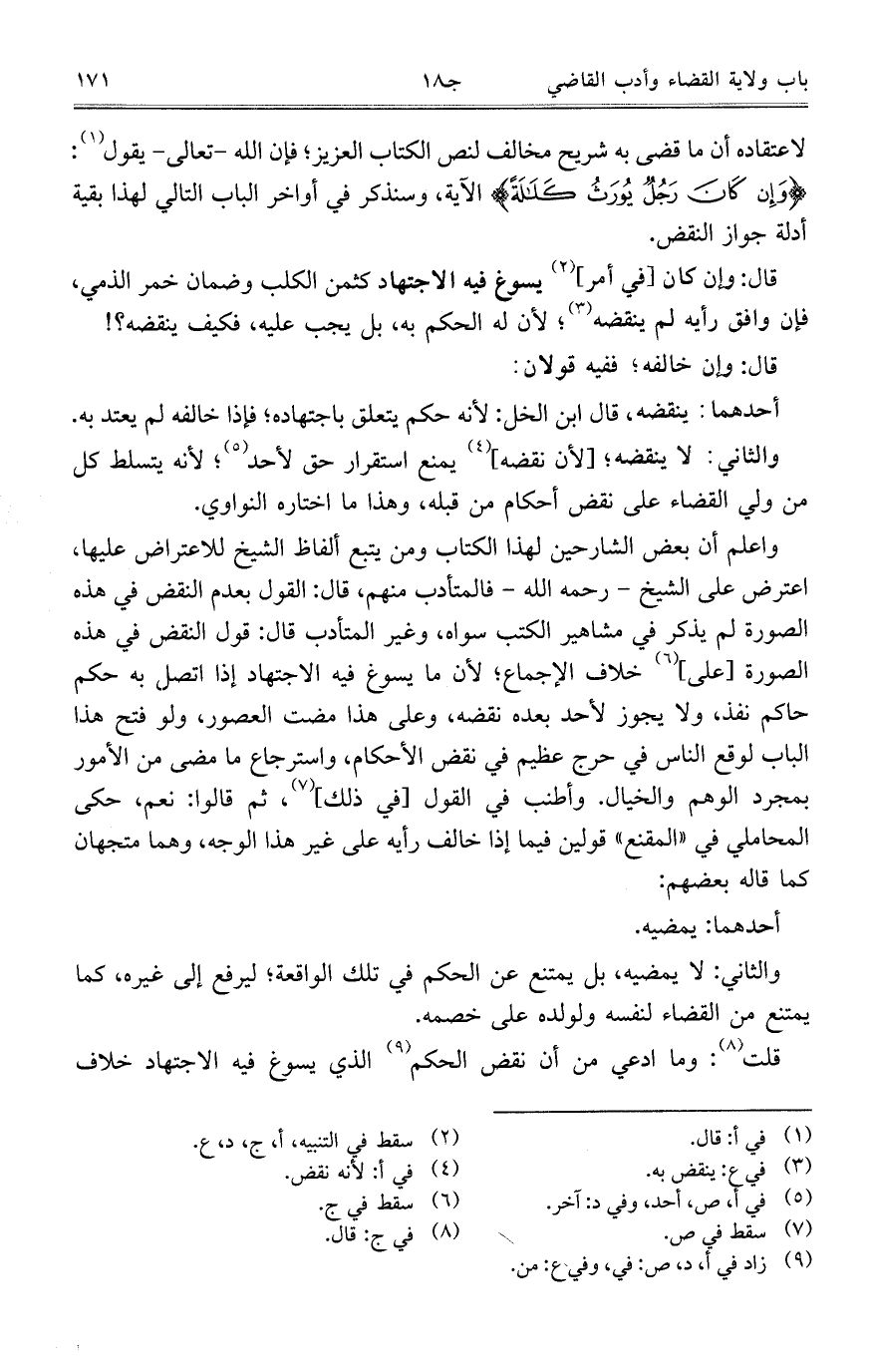 واعلم أن بعض الشارحين لهذا الكتاب ومن يتبع ألفاظ الشيخ للاعتراض عليها، اعترض على الشيخ- رحمه الله- فالمتأدب منهم، قال: القول بعدم النقض في هذه الصورة لم يذكر في مشاهير الكتب سواه، وغير المتأدب قال: قول النقض في هذه الصورة [على] خلاف الإجماع؛ لأن ما يسوغ فيه الاجتهاد إذا اتصل به حكم حاكم نفذ، ولا يجوز لأحد بعده نقضه، وعلى هذا مضت العصور، ولو فتح هذا الباب لوقع الناس في حرج عظيم في نقض الأحكام، واسترجاع ما مضى من الأمور بمجرد الوهم والخيال. وأطنب في القول [في ذلك]، ثم قالوا: نعم، حكى المحاملي في "المقنع" قولين فيما إذا خالف رأيه على غير هذا الوجه، وهما متجهان كما قاله بعضهم: