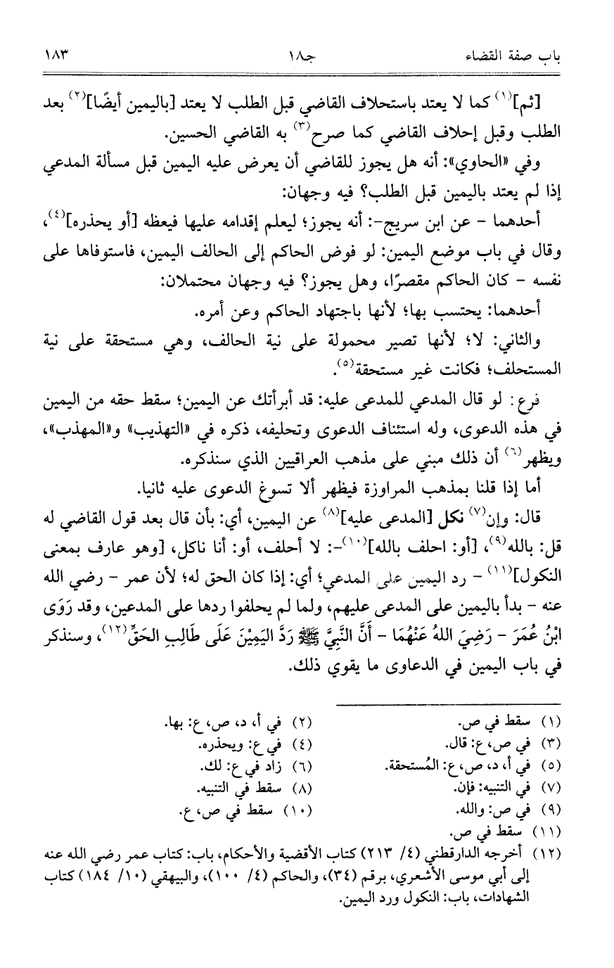 قال: وإن نكل [المدعى عليه] عن اليمين، أي: بأن قال بعد قول القاضي له قل: بالله، [أو: احلف بالله]-: لا أحلف، أو: أنا ناكل، [وهو عارف بمعنى النكول]- رد اليمين على المدعي؛ أي: إذا كان الحق له؛ لأن عمر- رضي الله عنه- بدأ باليمين على المدعى عليهم، ولما لم يحلفوا ردها على المدعين، وقد رَوَى ابْنُ عُمَرَ- رَضِيَ اللهُ عَنْهُمَا- أَنَّ النَّبِيَّ صلى الله عليه وسلم رَدَّ اليَمِيْنَ عَلَى طَالِبِ الحَقِّ، وسنذكر في باب اليمين في الدعاوى ما يقوي ذلك.