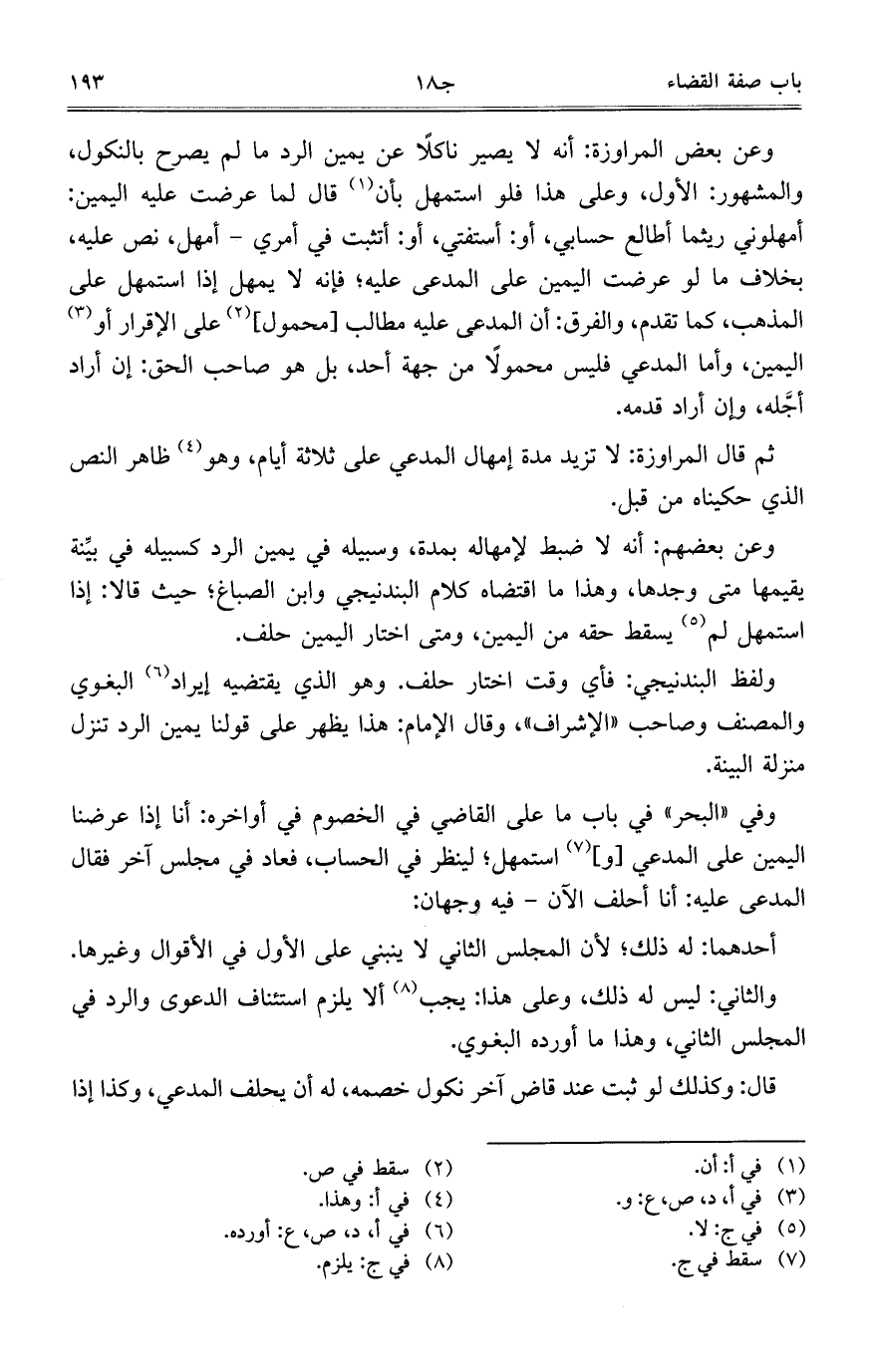 وعن بعض المراوزة: أنه لا يصير ناكلاً عن يمين الرد ما لم يصرح بالنكول، والمشهور: الأول، وعلى هذا فلو استمهل بأن قال لما عرضت عليه اليمين: أمهلوني ريثما أطالع حسابي، أو: أستفتي، أو: أتثبت في أمري- أمهل، نص عليه، بخلاف ما لو عرضت اليمين على المدعى عليه؛ فإنه لا يمهل إذا استمهل على المذهب، كما تقدم، والفرق: أن المدعى عليه مطالب [محمول] على الإقرار أو اليمين، وأما المدعي فليس محمولاً من جهة أحد، بل هو صاحب الحق: إن أراد أجَّله، وإن أراد قدمه.