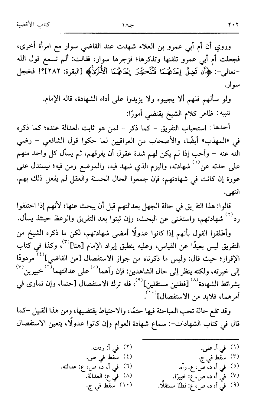 وأطلقوا القول بأنهم إذا كانوا عدولاً أمضى شهادتهم، لكن ما ذكره الشيخ من التفريق ليس بعيداً عن القياس، وعليه ينطبق إيراد الإمام [هنا]، وكذا في كتاب الإقرار؛ حيث قال: وليس ما ذكرناه من جواز الاستفصال [من القاضي] مردوداً إلى خيرته، ولكنه ينظر إلى حال الشاهدين: فإن رآهما على عدالتهما خبيرين بشرائط الشهادة [فطنين مستقلين]، فله ترك الاستفصال [حتماً، وإن تمارى في أمرهما، فلابد من الاستفصال].