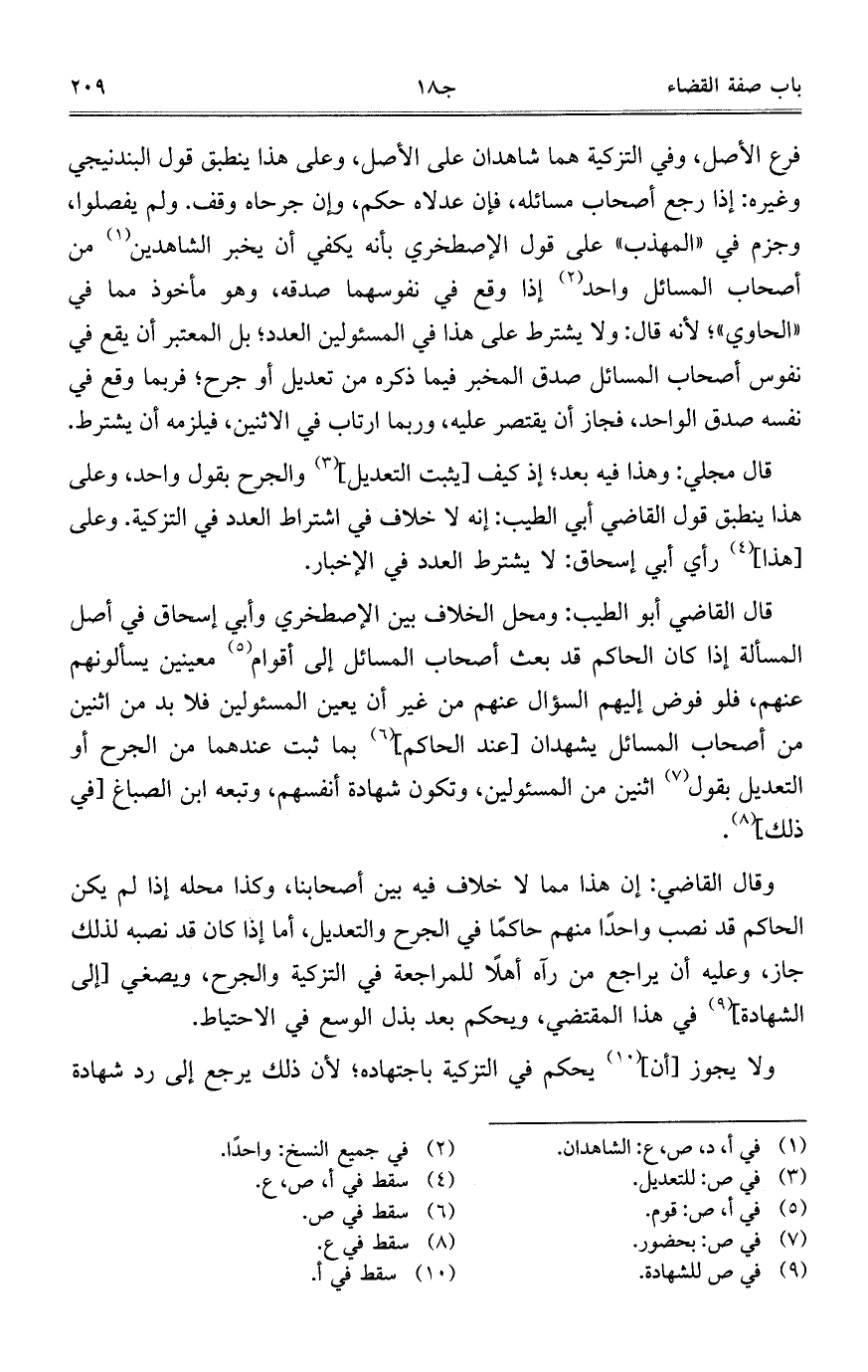 وقال القاضي: إن هذا مما لا خلاف فيه بين أصحابنا، وكذا محله إذا لم يكن الحاكم قد نصب واحداً منهم حاكماً في الجرح والتعديل، أما إذا كان قد نصبه لذلك جاز، وعليه أن يراجع من رآه أهلاً للمراجعة في التزكية والجرح، ويصغي [إلى الشهادة] في هذا المقتضي، ويحكم بعد بذل الوسع في الاحتياط.