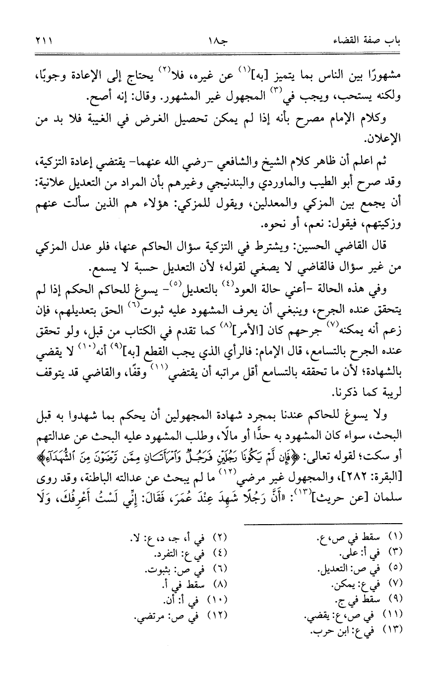 ولا يسوغ للحاكم عندنا بمجرد شهادة المجهولين أن يحمك بما شهدوا به قبل البحث، سواء كان المشهود به حدّاً أو مالاً، وطلب المشهود عليه البحث عن عدالتهم أو سكت؛ لقوله تعالى: {فَإِنْ لَمْ يَكُونَا رَجُلَيْنِ فَرَجُلٌ وَامْرَأَتَانِ مِمَّنْ تَرْضَوْنَ مِنْ الشُّهَدَاءِ} [البقرة: 282]، والمجهول غير مرضي ما لم يبحث عن عدالته الباطنة، وقد روى سلمان [عن حريث]: "أَنَّ رَجُلاً شَهِدَ عِنْدَ عُمَرَ، فَقَالَ: إِنِّي لَسْتُ أَعْرِفُكَ، وَلَا