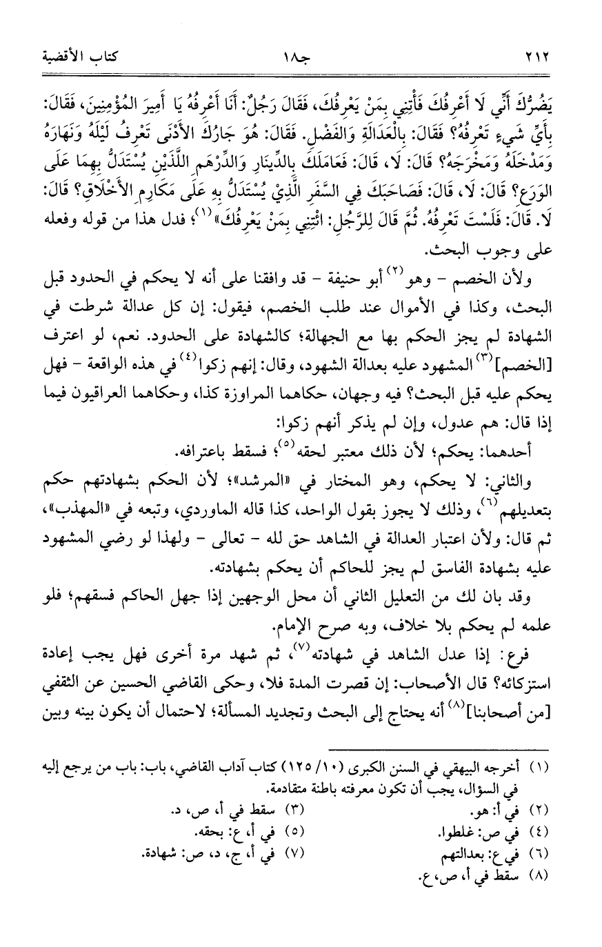 ولأن الخصم- وهو أبو حنيفة- قد وافقنا على أنه لا يحكم في الحدود قبل البحث، وكذا في الأموال عند طلب الخصم، فيقول: إن كل عدالة شرطت في الشهادة لم يجز الحكم بها مع الجهالة؛ كالشهادة على الحدود. نعم، لو اعترف [الخصم] المشهود عليه بعدالة الشهود، وقال: إنهم زكوا في هذه الواقعة- فهل يحكم عليه قبل البحث؟ فيه وجهان، حكاهما المراوزة كذا، وحكاهما العراقيون فيما إذا قال: هم عدول، وإن لم يذكر أنهم زكوا: