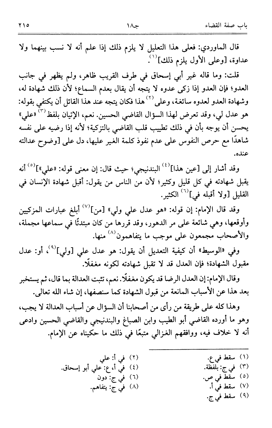 وهذا كله على طريقة من رأى من أصحابنا أن السؤال عن أسباب العدالة لا يجب، وهو ما أورده القاضي أبو الطيب وابن الصباغ والبندنيجي والقاضي الحسين وادعى أنه لا خلاف فيه، ووافقهم الغزالي متبعاً في ذلك ما حكيناه عن الإمام.