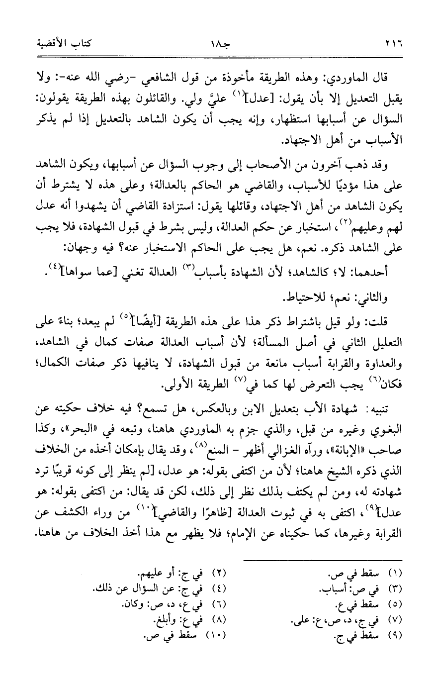 وقد ذهب آخرون من الأصحاب إلى وجوب السؤال عن أسبابها، ويكون الشاهد على هذا مؤدياً للأسباب، والقاضي هو الحاكم بالعدالة؛ وعلى هذه لا يشترط أن يكون الشاهد من أهل الاجتهاد، وقائلها يقول: استزادة القاضي أن يشهدوا أنه عدل لهم وعليهم، استخبار عن حكم العدالة، وليس بشرط في قبول الشهادة، فلا يجب على الشاهد ذكره. نعم، هل يجب على الحاكم الاستخبار عنه؟ فيه وجهان: