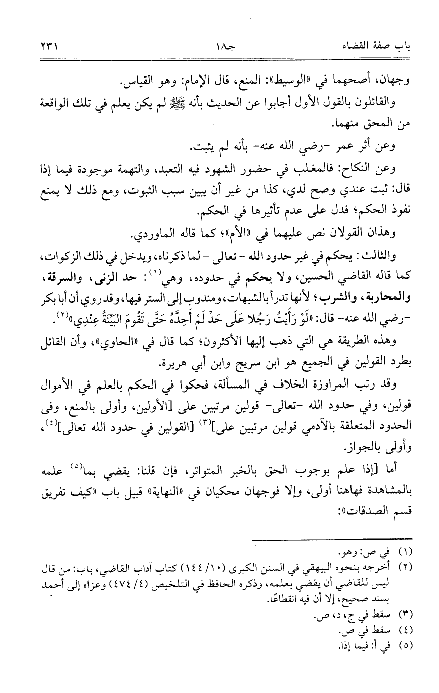والثالث: يحكم في غير حدود الله- تعالى- لما ذكرناه، ويدخل في ذلك الزكوات، كما قاله القاضي الحسين، ولا يحكم في حدوده، وهي: حد الزنى، والسرقة، والمحاربة، والشرب؛ لأنها تدرأ بالشبهات، ومندوب إلى الستر فيها، وقد روي أن أبا بكر- رضي الله عنه- قال: "لَوْ رَأَيْتُ رَجُلاً عَلَى حَدِّ لَمْ أَحِدَّهُ حَتَّى تَقُومَ البَيِّنَةُ عِنْدِي".