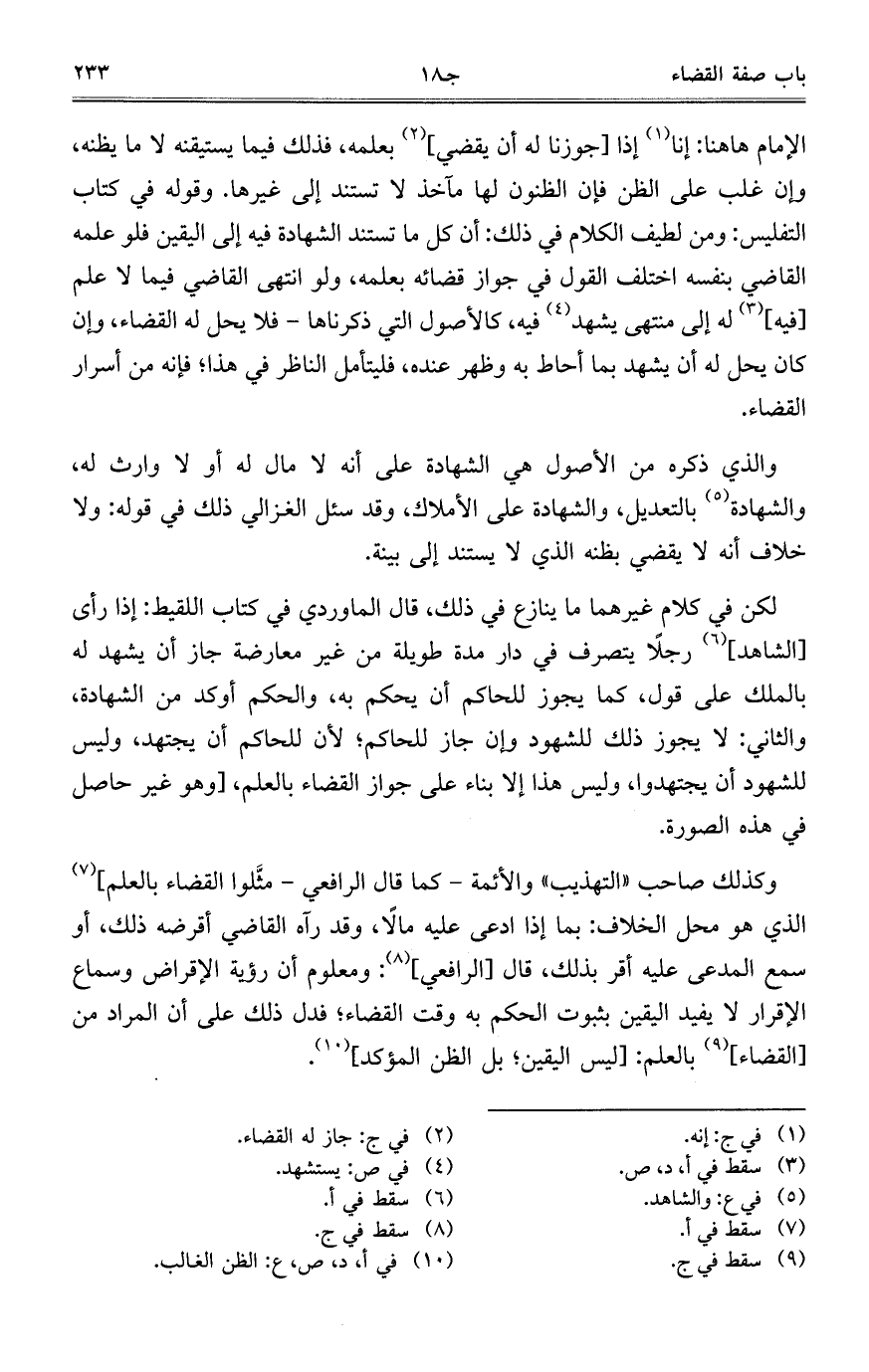 وكذلك صاحب "التهذيب" والأئمة- كما قال الرافعي- مثَّلوا القضاء بالعلم] الذي هو محل الخلاف: بما إذا ادعى عليه مالاً، وقد رآه القاضي أقرضه ذلك، أو سمع المدعى عليه أقر بذلك، قال [الرافعي]: ومعلوم أن رؤية الإقراض وسماع الإقرار لا يفيد اليقين بثبوت الحكم به وقت القضاء؛ فدل ذلك على أن المراد من [القضاء] بالعلم: [ليس اليقين؛ بل الظن المؤكد].