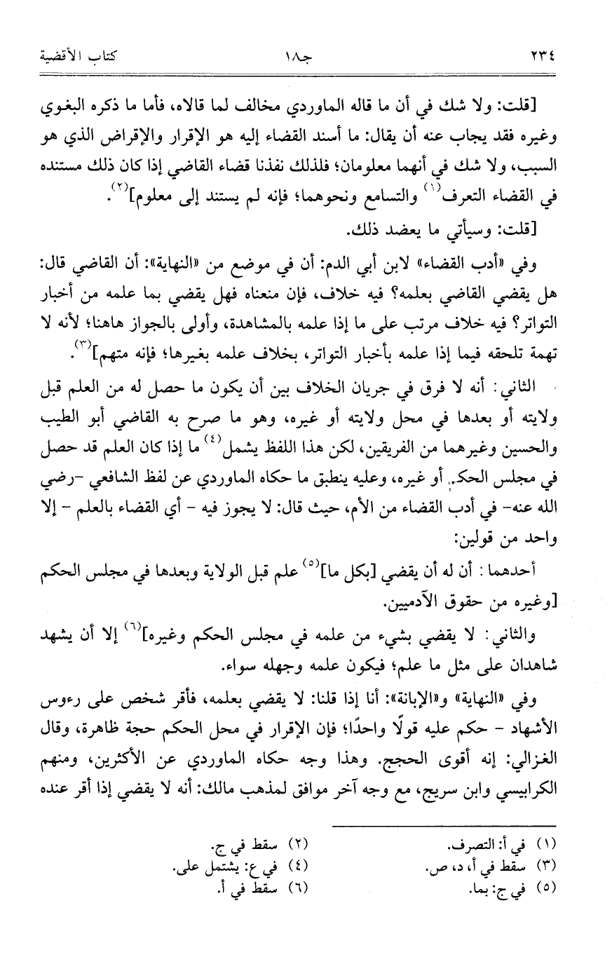 [قلت: ولا شك في أن ما قاله الماوردي مخالف لما قالاه، فأما ما ذكره البغوي وغيره فقد يجاب عنه أن يقال: ما أسند القضاء إليه هو الإقرار والإقرار الذي هو السبب، ولاشك في أنهما معلومان؛ فلذلك نفذنا قضاء القاضي إذا كان ذلك مستنده في القضاء التعرف والتسامع ونحوهما؛ فإنه لم يستند إلى معلوم].