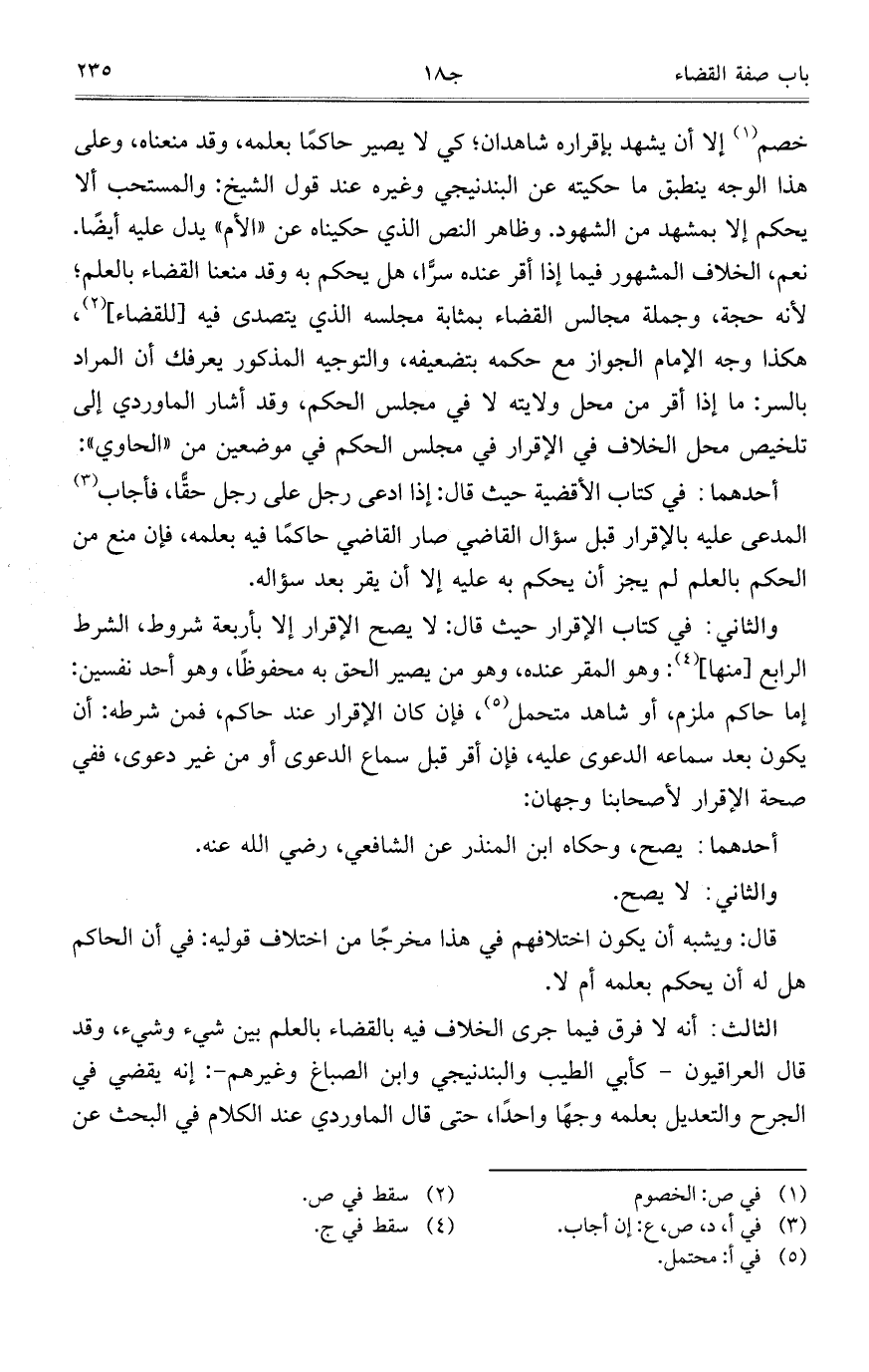 أحدهما: في كتاب الأقضية حيث قال: إذا ادعى رجل على رجل حقّاً، فأجاب المدعى عليه بالإقرار قبل سؤال القاضي صار القاضي حاكماً فيه بعلمه، فإن منع من الحكم بالعلم لم يجز أن يحكم به عليه إلا أن يقر بعد سؤاله.