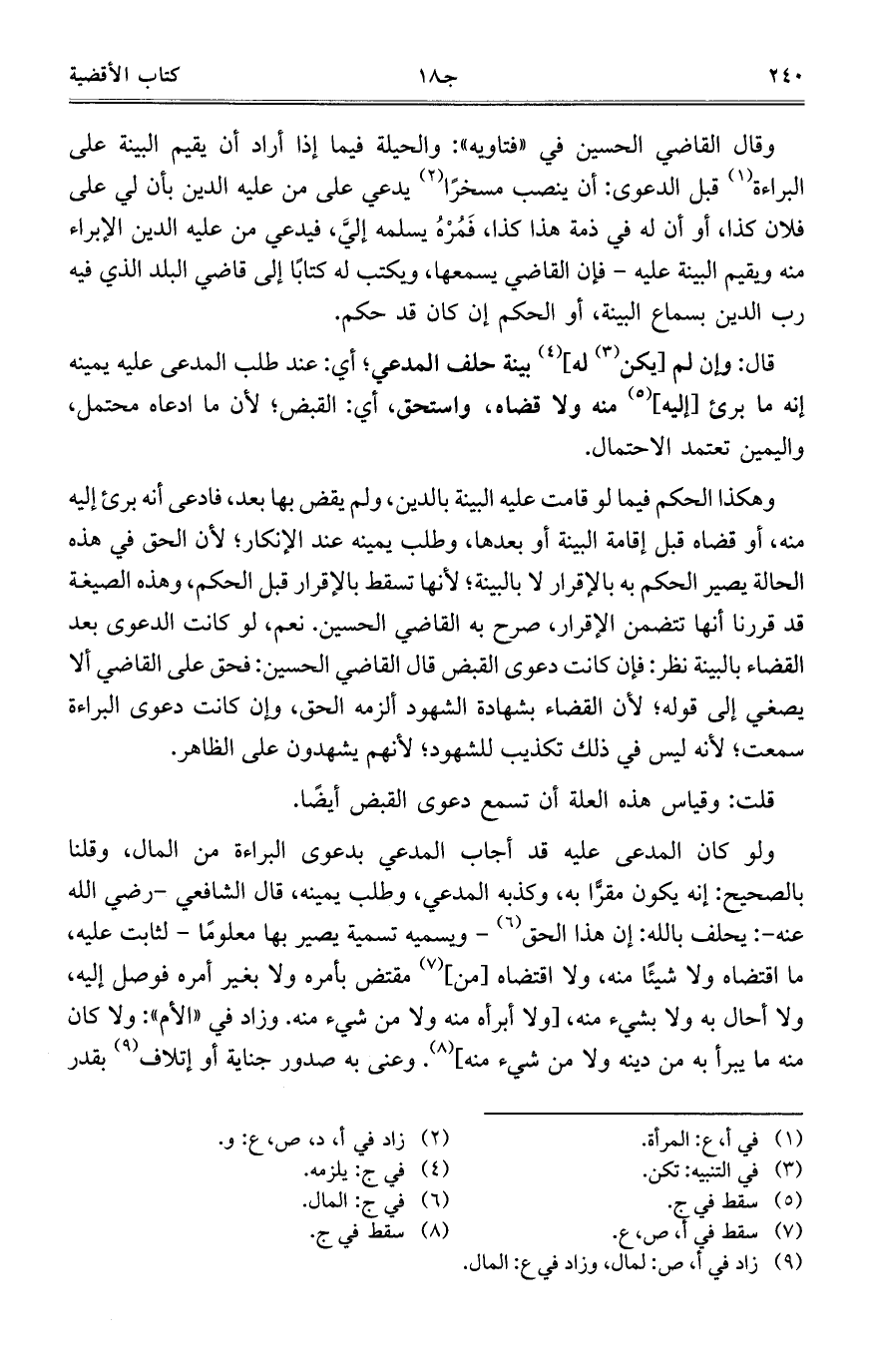 وقال القاضي الحسين في "فتاويه": والحيلة فيما إذا أراد أن يقيم البينة على البراءة قبل الدعوى: أن ينصب مسخراً يدعي على من عليه الدين بأن لي على فلان كذا، أو أن له في ذمة هذا كذا، فَمُرْهُ يسلمه إليَّ، فيدعي من عليه الدين الإبراء منه ويقيم البينة عليه- فإن القاضي يسمعها، ويكتب له كتاباً إلى قاضي البلد الذي فيه رب الدين بسماع البينة، أو الحكم إن كان قد حكم.