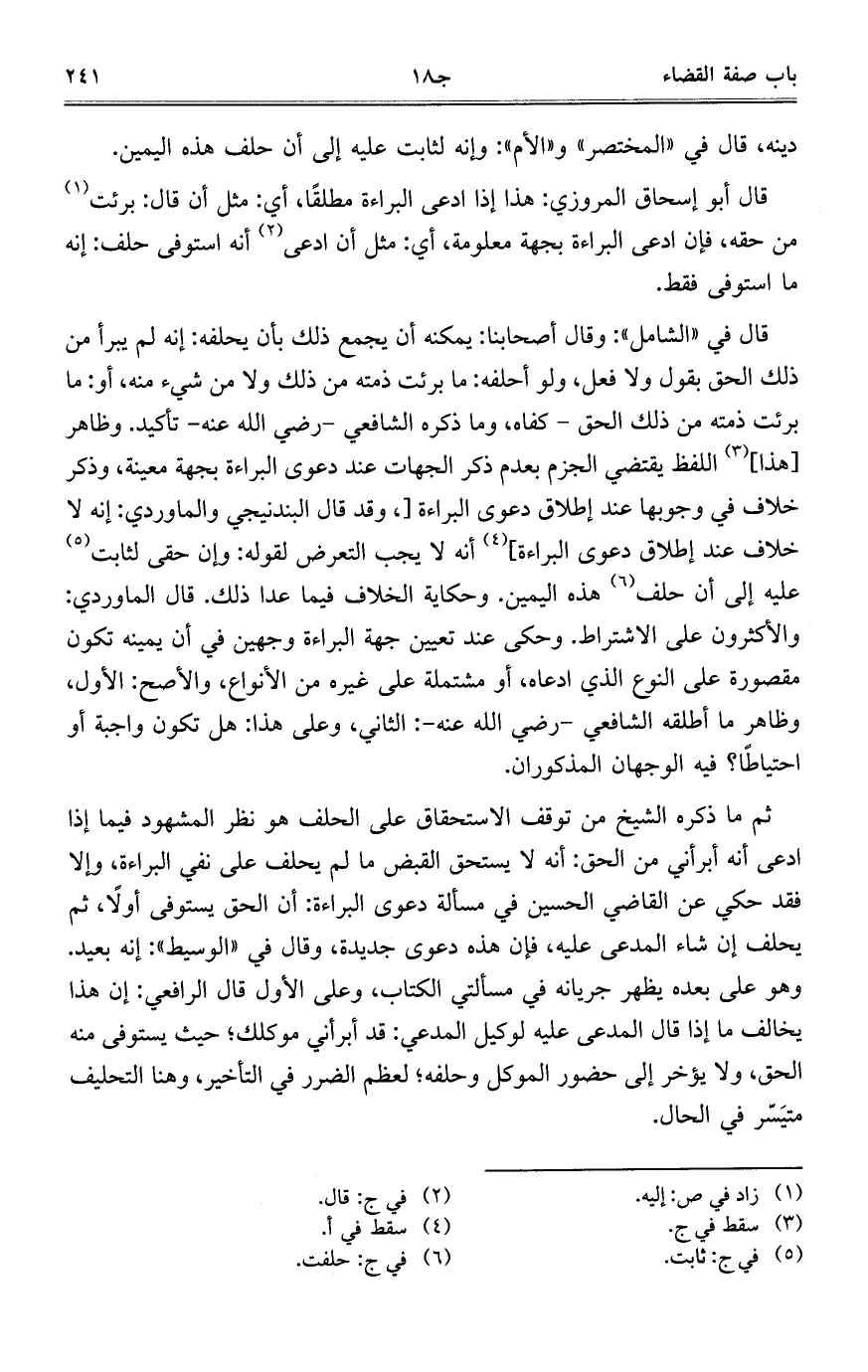 قال أبو إسحاق المروزي: هذا إذا ادعى البراءة مطلقاً، أي: مثل أن قال: برئت من حقه، فإن ادعى البراءة بجهة معلومة، أي: مثل أن ادعى أنه استوفى حلف: إنه ما استوفى فقط.