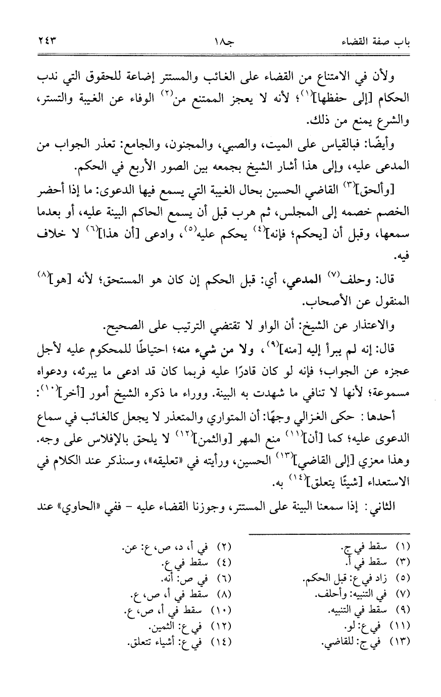 ولأن في الامتناع من القضاء على الغائب والمستتر إضاعة للحقوق التي ندب الحكام [إلى حفظها]؛ لأنه لا يعجز الممتنع من الوفاء عن الغيبة والتستر، والشرع يمنع من ذلك.