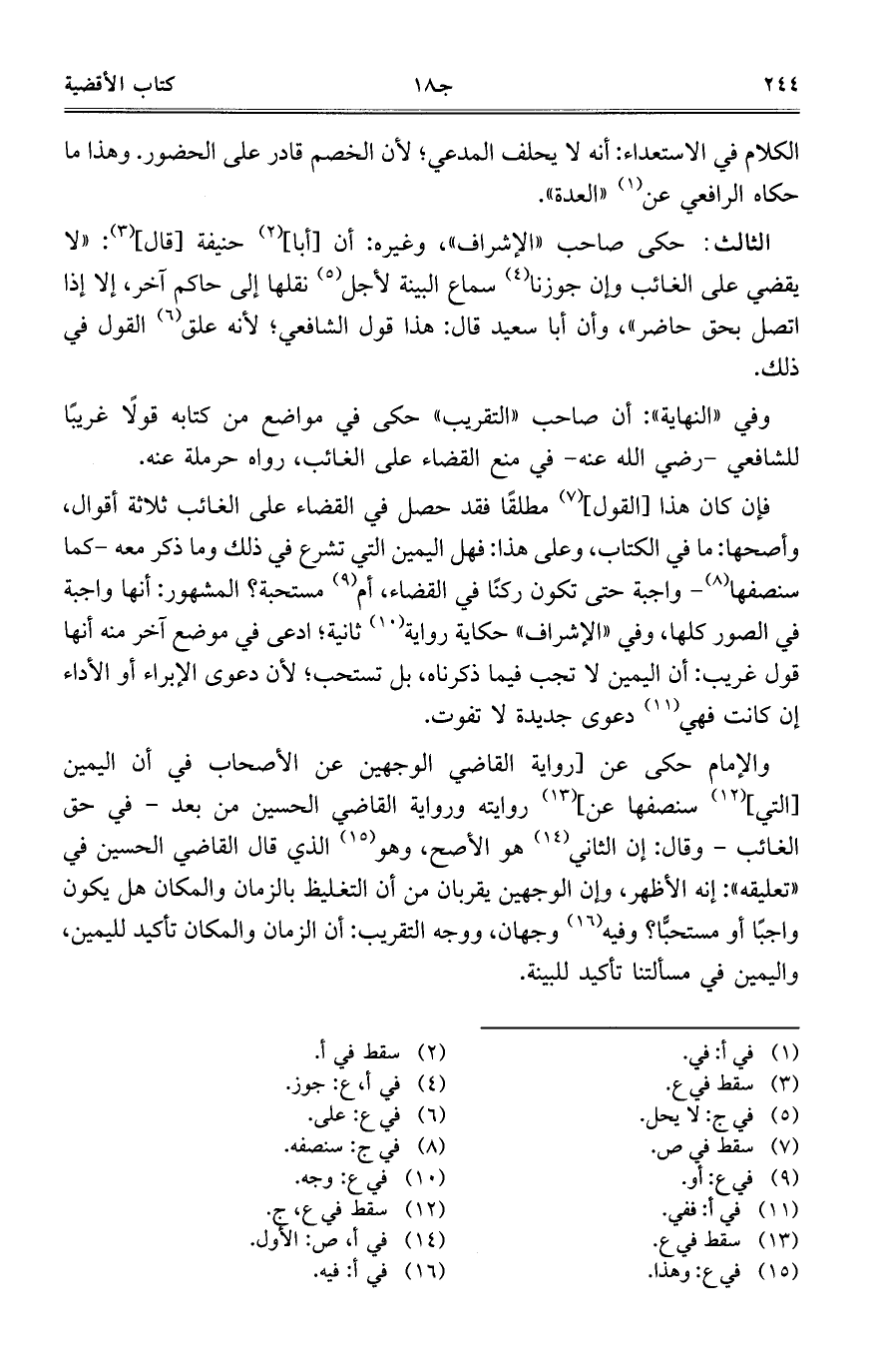 فإن كان هذا [القول] مطلقاً فقد حصل في القضاء على الغائب ثلاثة أقوال، وأصحها: ما في الكتاب، وعلى هذا: فهل اليمين التي تشرع في ذلك وما ذكر معه- كما سنصفها- واجبة حتى تكون ركناً في القضاء، أم مستحبة؟ المشهور: أنها واجبة في الصور كلها، وفي "الإشراف" حكاية رواية ثانية؛ ادعى في موضع آخر منه أنها قول غريب: أن اليمين لا تجب فيما ذكرناه، بل تستحب؛ لأن دعوى الإبراء أو الأداء إن كانت فهي دعوى جديدة لا تفوت.