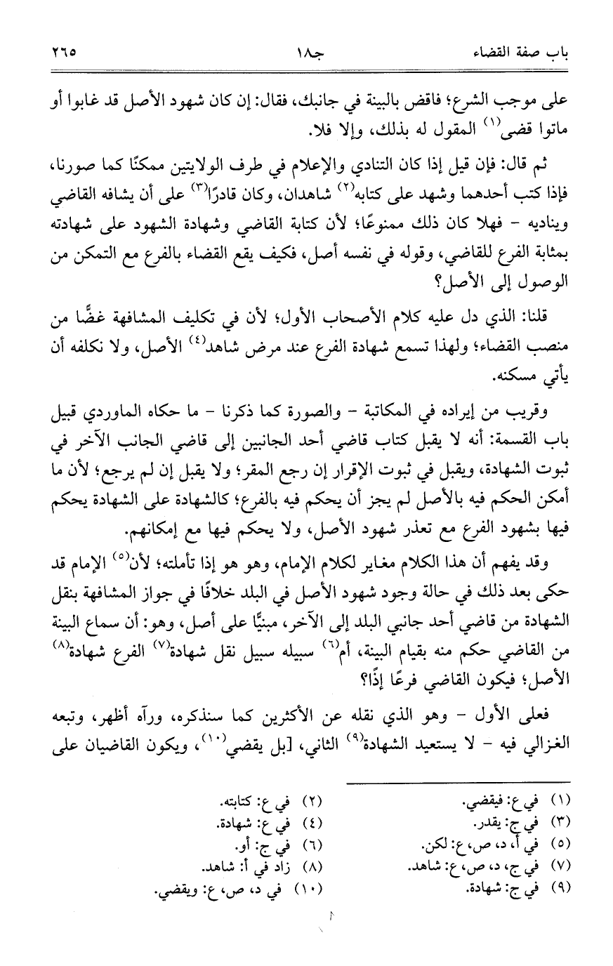 ثم قال: فإن قيل إذا كان التنادي والإعلام في طرف الولايتين ممكناً كما صورنا، فإذا كتب أحدهما وشهد على كتابه شاهدان، وكان قادراً على أن يشافه القاضي ويناديه- فهلا كان ذلك ممنوعاً؛ لأن كتابة القاضي وشهادة الشهود على شهادته بمثابة الفرع للقاضي، وقوله في نفسه أصل، فكيف يقع القضاء بالفرع مع التمكن من الوصول إلى الأصل؟
