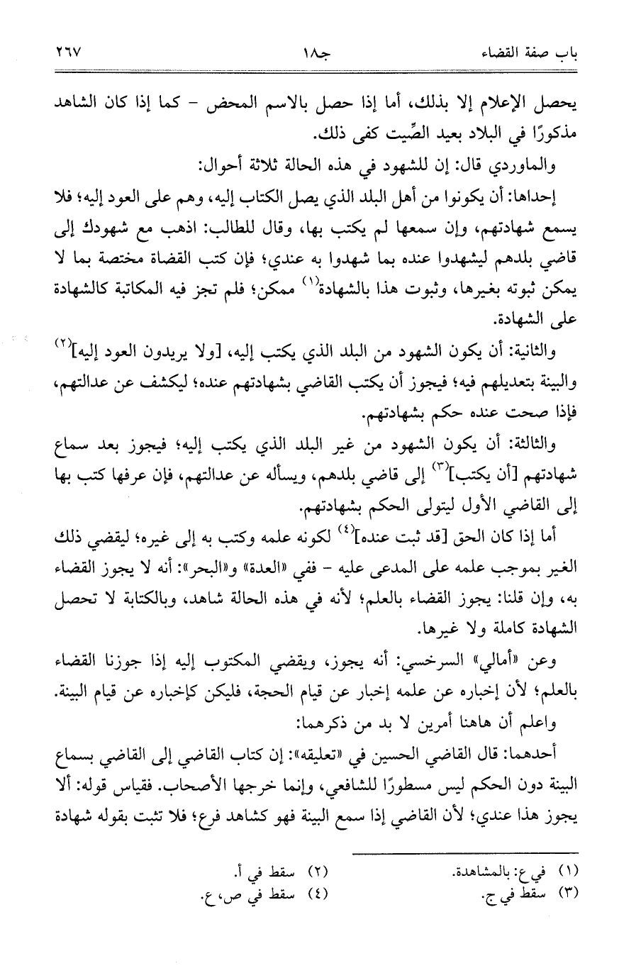 إحداها: أن يكونوا من أهل البلد الذي يصل الكتاب إليه، وهم على العود إليه؛ فلا يسمع شهادتهم، وإن سمعها لم يكتب بها، وقال للطالب: اذهب مع شهودك إلى قاضي بلدهم ليشهدوا عنده بما شهدوا به عندي؛ فإن كتب القضاة مختصة بما لا يمكن ثبوته بغيرها، وثبوت هذا بالشهادة ممكن؛ فلم تجز فيه المكاتبة كالشهادة على الشهادة.