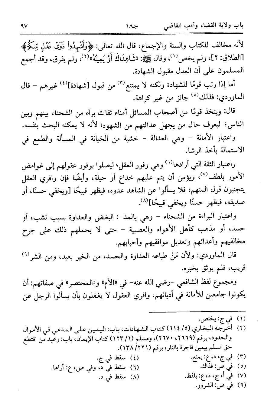 واعتبار الثقة التي أرادها وهي وفور العقل؛ ليصلوا بوفور عقولهم إلى غوامض الأمور بلطف، ويؤمن أن يتم عليهم خداع أو حيلة، وأيضاً فإن وافري العقل يتجنبون قول المتهم؛ فلا يسألوا عن الشاهد عدوه، فيظهر قبيحاً [ويخفي حسناً، أو صديقه، فيظهر حسناً ويخفي قبيحاً].